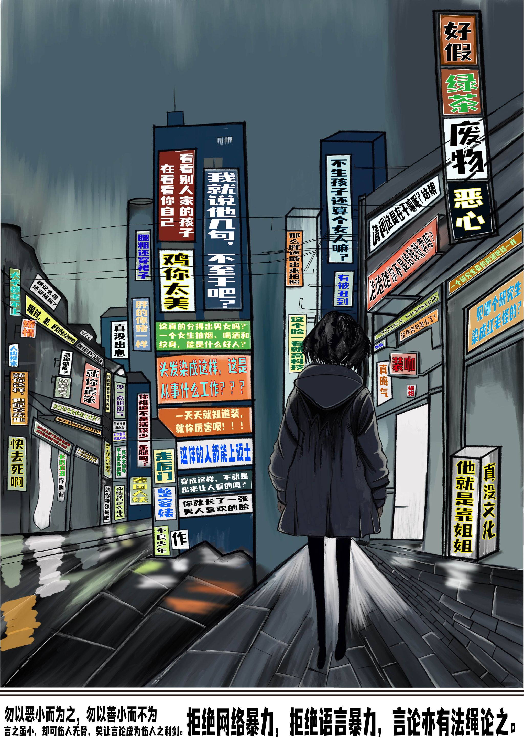 作品简介:深夜的街头,一个小女孩独自面对广告牌上刺眼的伤人文字,这些文字却在街头最耀眼的广告牌上面堂而皇之的出现,是讽刺的,这是一幅描绘网络言论暴力现实的画面。可以警示我们,当言语成为伤人的利剑,无视其伤害即成为共犯。这无声的控诉,期望唤起人们对友善言论的关注与守护。