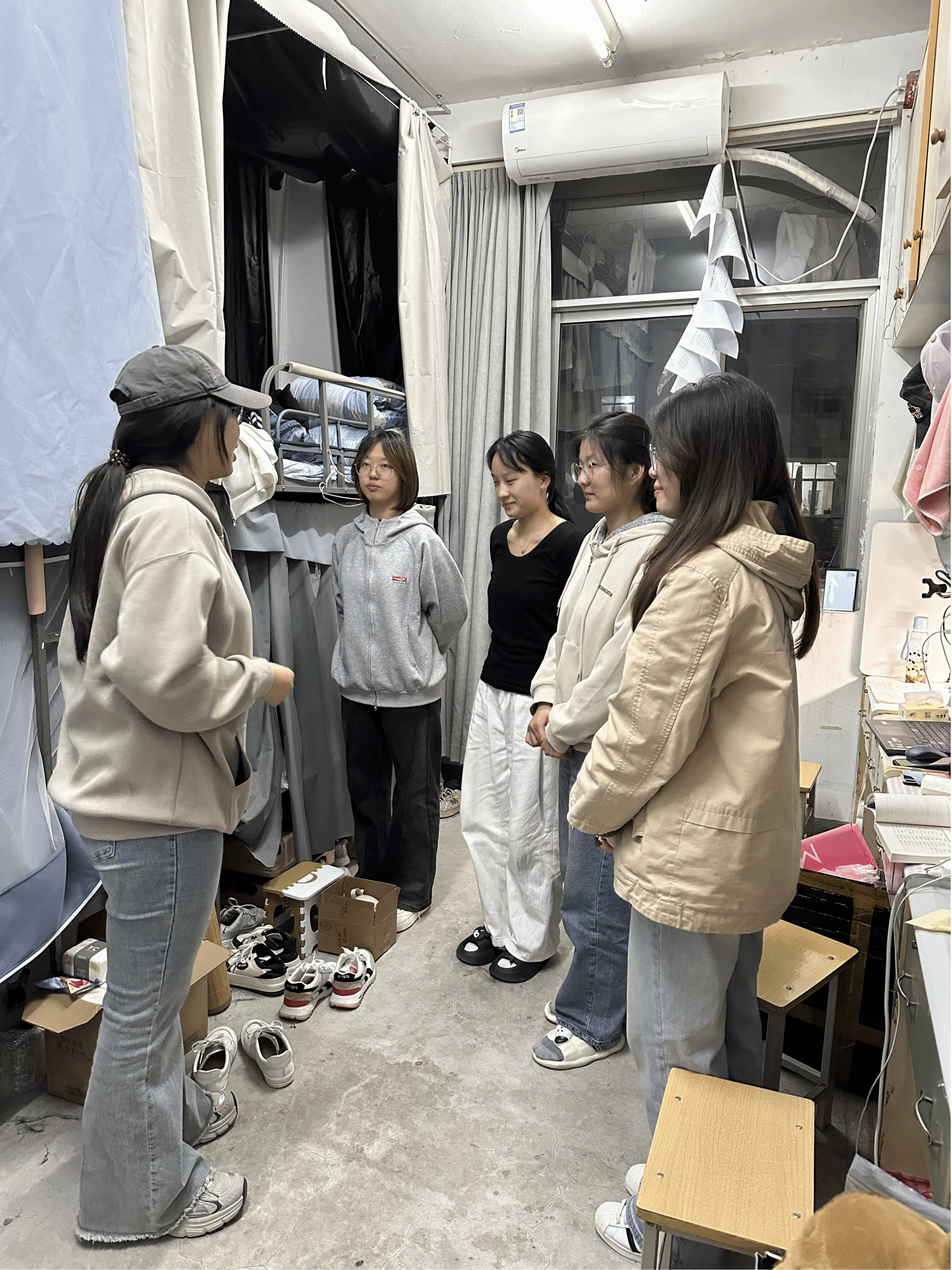 检查过程中,两位班委逐一走访班级7间宿舍,重点查看床铺整理、物品摆放、地面清洁及用电安全情况。生活委员王涵对照宿舍卫生细则详细检查各宿舍卫生状况,针对插线板随意放置、桌面杂物堆积等问题提出整改建议,团支书陈一诺结合实例讲解宿舍防火和用电知识,提醒同学们做到“人走电断、隐患立消”。检查间隙,班委们还发现了暖心画面:2号楼607宿舍成员为了攻克广播电视编导复杂的课程作业,她们宿舍形成默契,只要有人抛出问题,其他人便立刻停下手中事,结合课堂所学和实践经验,认真帮着剖析解答,展现了同窗间的深厚情谊。卫生检查结束后,生活委员王涵、团支书陈一诺在宿舍公共活动区开展学风建设微宣讲。她们结合新闻传播专业特色,以优秀校友案例强调“宿舍是学风培育的土壤”,号召同学们将整洁环境转化为学习动力。