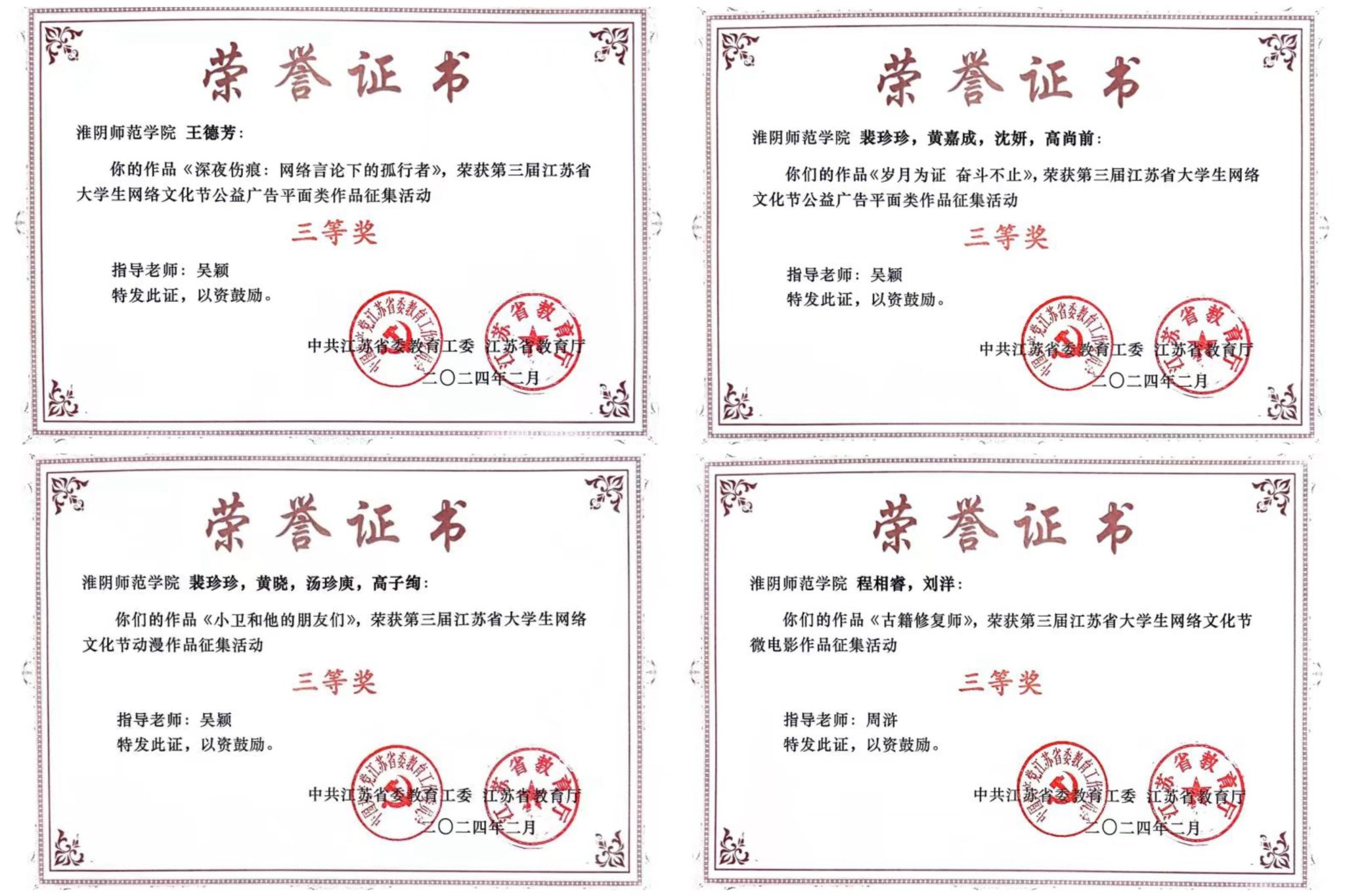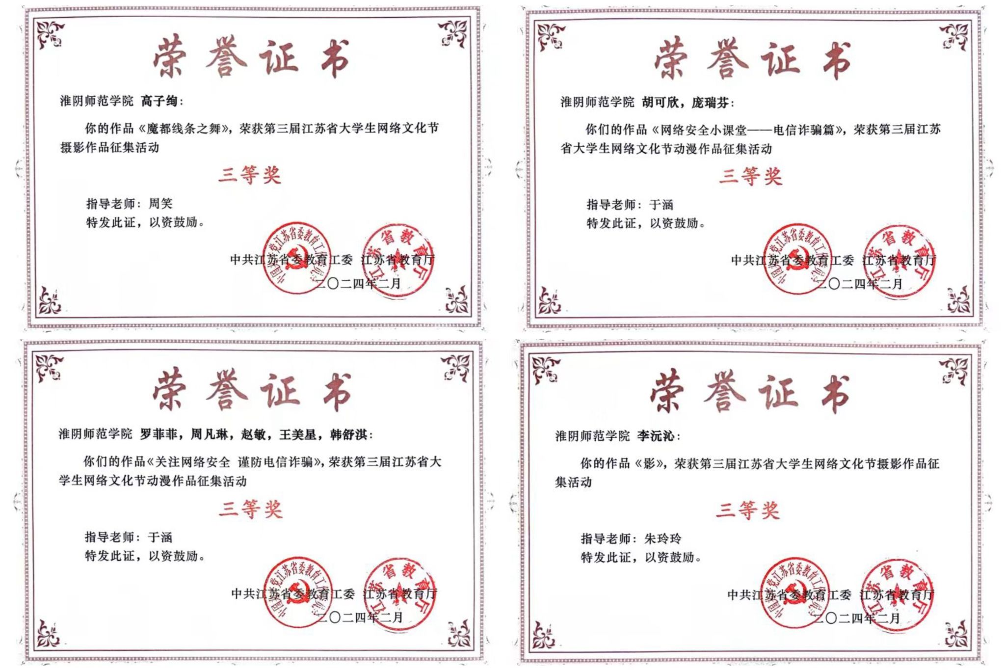 江苏省大学生网络文化节是由省委教育工委、省教育厅举办,本届江苏省大学生网络文化节以“争做校园好网民,汇聚网络正能量,挺膺担当建新功”为主题,旨在通过活动鼓励引导广大青年学生积极参与网络文化作品创作生产,扩大高校网络文化的影响力,不断强化守正创新,增强新时代高校思想政治工作的吸引力和时效性。近年来,我校高度重视大学生网络思想政治教育,引导学生结合专业特色,积极创作导向正确、内容生动、形式多样的网络文化作品,推选出了一批有影响力、有代表性、有引领力的网络文化作品,充分展现了淮师学子积极向上的精神风貌。