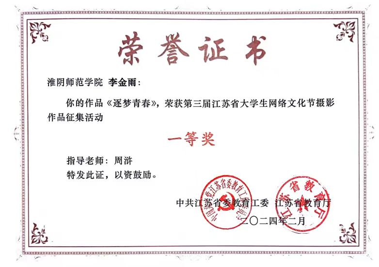 由周浒老师指导,李金雨同学创作的摄影作品《逐梦青春》获摄影类作品一等奖,该作品以组图的形式展现了青年大学生有理想,敢担当,能吃苦,肯奋斗的青春形象。
