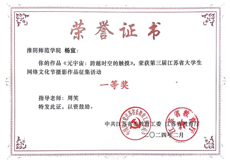 近日,由省委教育工委、省教育厅组织开展的“第三届江苏省大学生网络文化节”和“第三届江苏省高校网络教育优秀作品推选展示活动”评选结果公布。全讯800cc大白菜获得一等奖2项,三等奖8项。摄影类一等奖作品《逐梦青春》《元宇宙: 跨越时空的触摸》和公益广告作品平面类三等奖作品《深夜伤痕: 网络言论下的孤行者》等被推荐参评第七届全国大学生网络文化节。