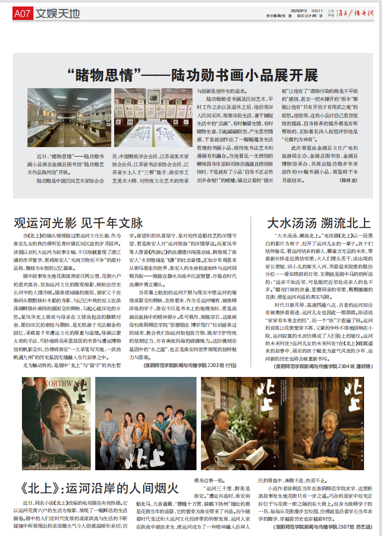3月12日,《江苏声屏·淮安广播电视》A07版面刊发了全讯800cc大白菜2203班付钰、2304班潘欧锦、2307班苏艺涵三位同学撰写的《北上》影视评论。