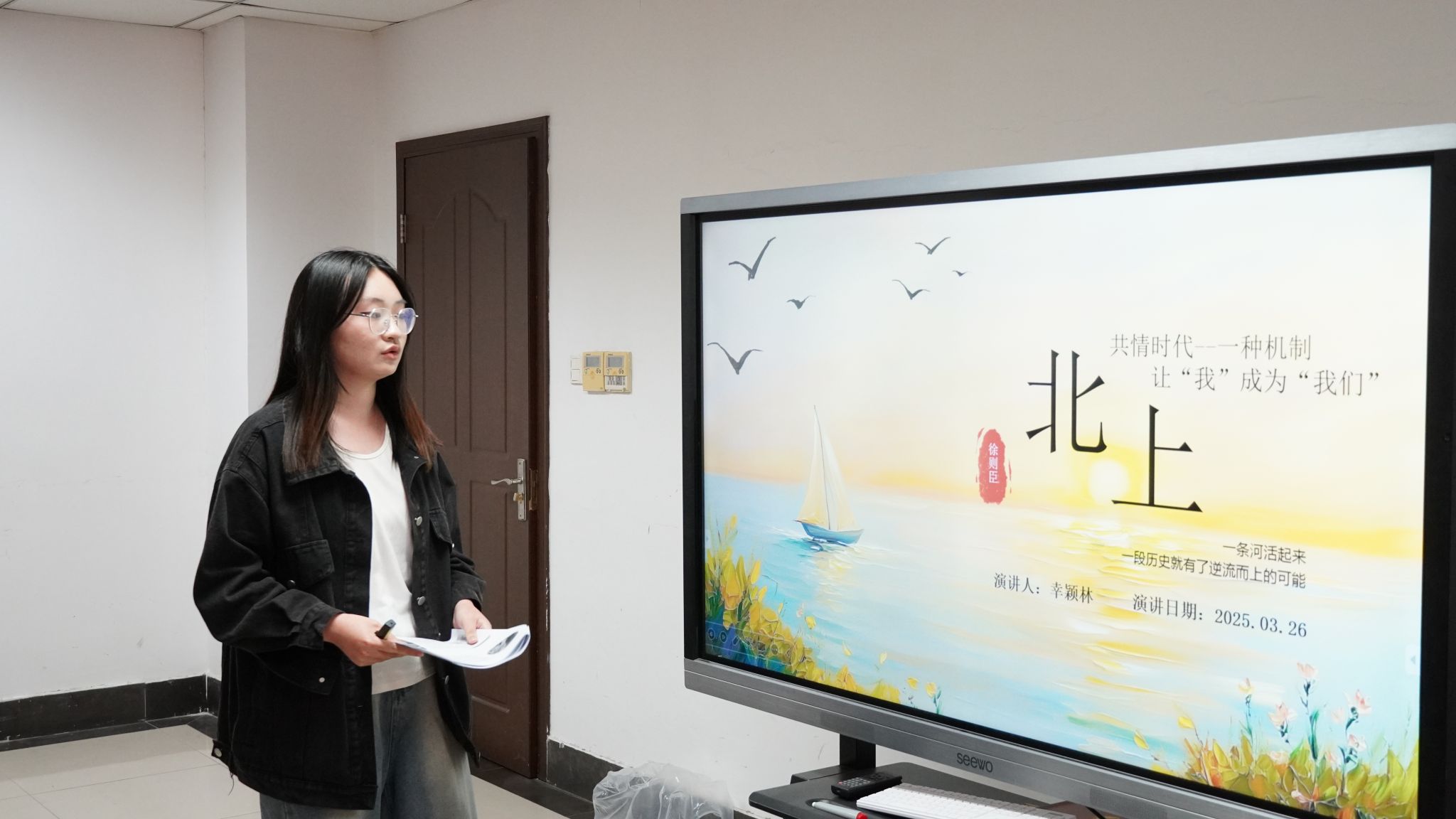 主题分享环节,四位同学结合PPT,从文学、影视、文化传播等多个角度,围绕徐则臣同名小说及其影视改编作品《北上》展开深度讨论。赵冠宇组从媒介特性出发,分析文学与影视在传播效果上的互补性,强调影视化对扩大作品影响力的显著作用;蔺佳欣组对比小说与电视剧的叙事差异,指出小说以文字激发读者想象,影视则凭借视听语言直观呈现内容,并结合收视率数据与观众反馈,揭示影视改编对原著传播的双刃剑效应;幸颖林组剖析谢平遥与小波罗的文化冲突,将其视为中西文明对抗与融合的缩影,并通过邵星池父子在传统与现代间的挣扎,挖掘出运河文化传承的深层意义,进而提出“无意义之事的意义”这一核心命题,强调个体在历史洪流中的精神觉醒;朱彩云组以运河的历史感、沧桑感、命运感为主线,结合自身在淮安的生活体验,分析影视改编对“青春奋斗”主题的强化,探讨运河文化在当代的价值,呼吁青年关注传统文化的现代表达。