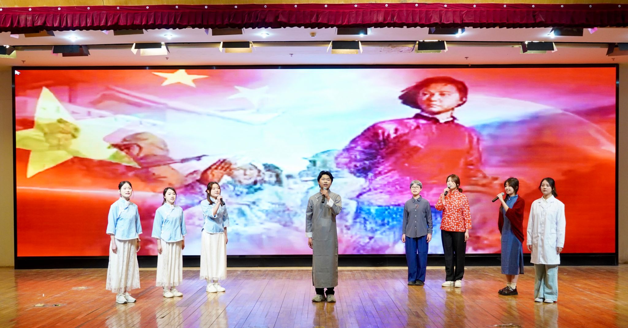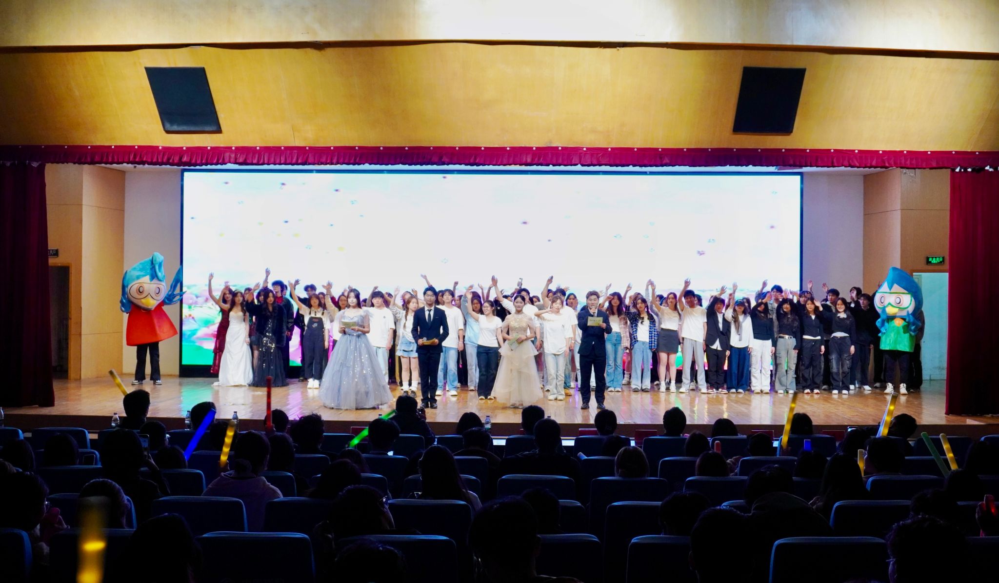 开幕式节目精彩纷呈,通过歌舞、朗诵、小品、走秀等多元形式,传递正能量,彰显传媒人的责任与担当。朗诵《你是谁》让我们看见那段热血激昂的峥嵘岁月,更听见传媒人以笔为剑、以声为铎的铿锵誓言;小品《反诈中心》通过“以骗制骗”的巧妙反转,在欢声笑语中普及反诈知识,用艺术力量筑牢安全防线;电影角色创意走秀成为亮点,同学们化身经典影视人物,通过服装与表演重现光影传奇;国风舞蹈《姿》、歌曲《海芋恋》《不潮不用花钱》等节目活力满满、激扬热烈。最后,大合唱《我乘着风飞过来》将全场气氛推向高潮,展现了青年学子乘风破浪的奋斗姿态和青春挺膺的坚定誓言。