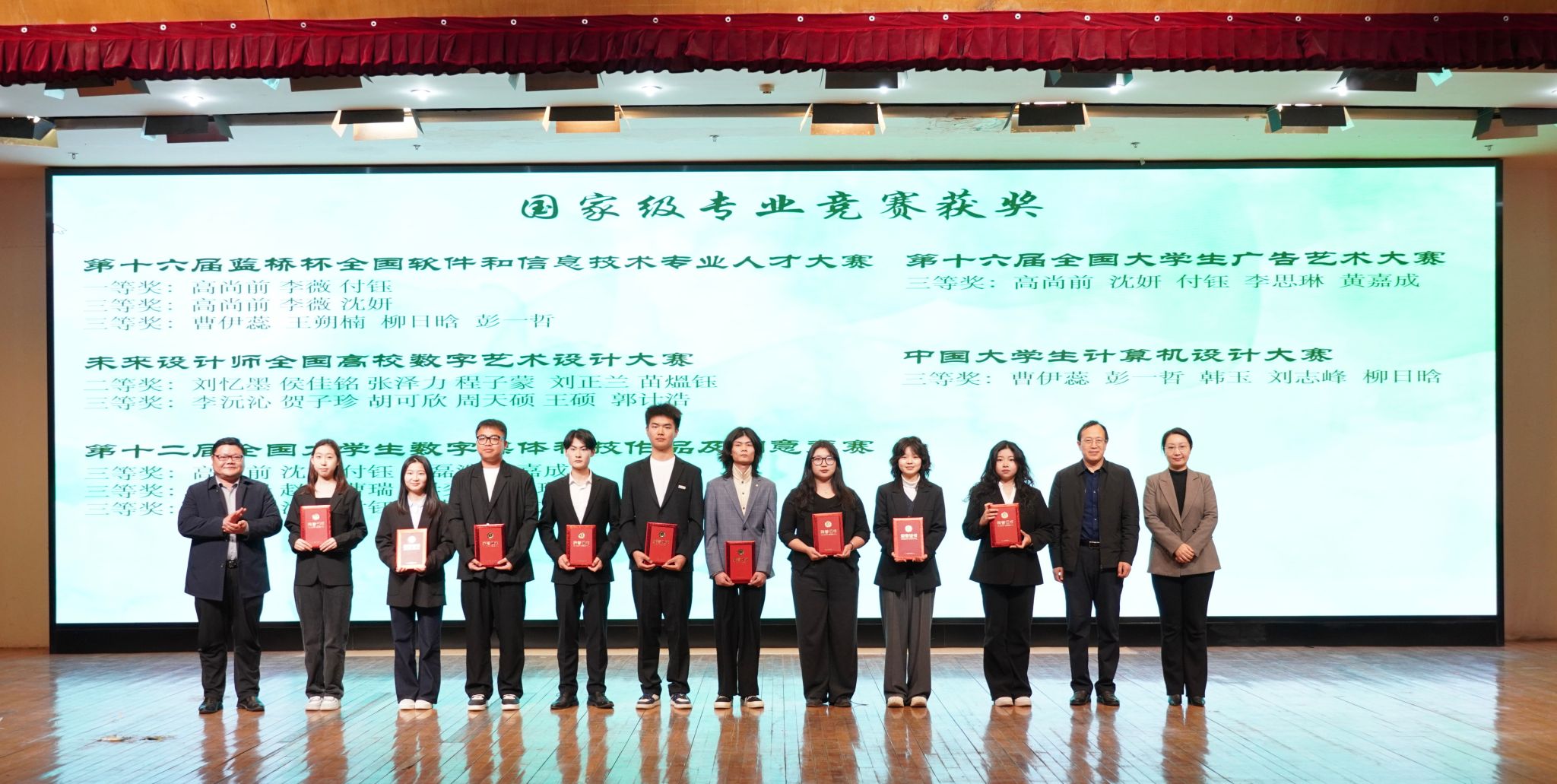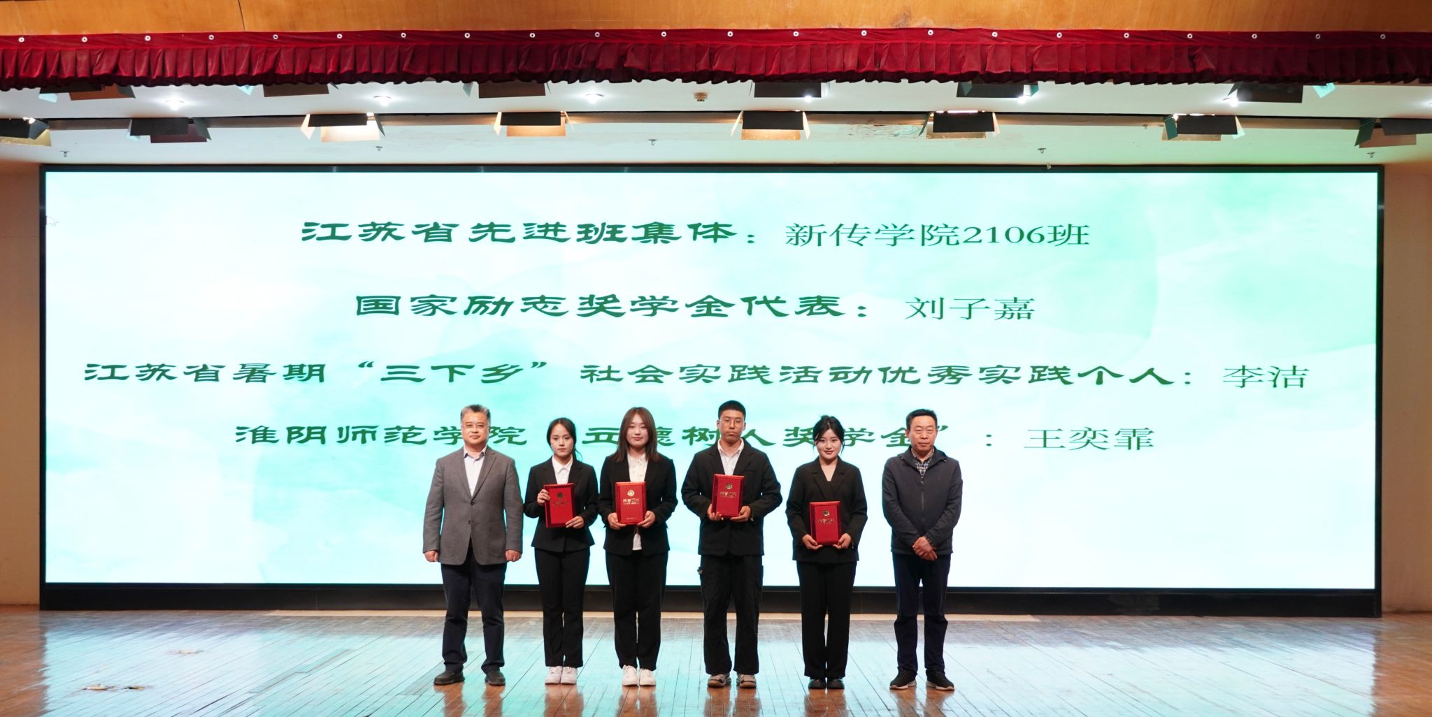 为树立先进典型,发挥榜样示范作用,开幕式现场还进行了颁奖仪式。党委宣传部部长管爱花为国家奖学金获得者颁奖,教务处处长周守勇、教师教育学院院长史晖为省级个人和集体荣誉获得者颁奖,党委学工部部长王管、团委书记纪元、新传学院党委书记任守军为国家级专业竞赛获奖者颁奖。