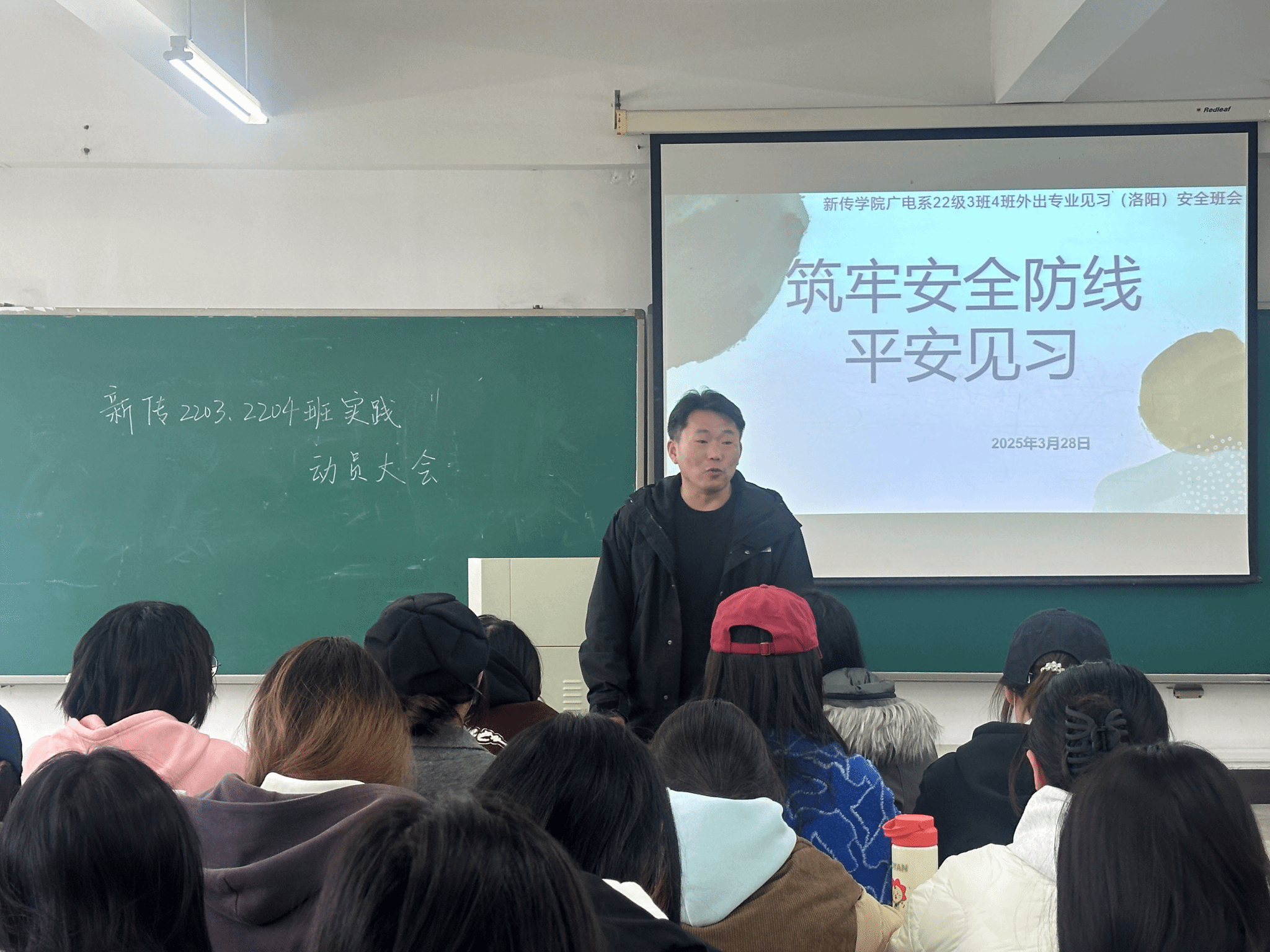 为拓宽同学们对保护传承中华优秀传统文化理念的认知,学习新媒体环境下的文化传播技巧,2025年3月28日,新传学院广电系举办“探洛阳遗迹 汲千年底蕴 续文化新篇”专业实践动员会。 动员会由广电系主任李德顺主持。他围绕外出见习的行程规划、专业学习、注意事项等多个方面,为同学们展开了详尽的外出实践说明,并着重强调了安全问题的重要性,殷切叮嘱同学们牢固树立个人安全防范意识。