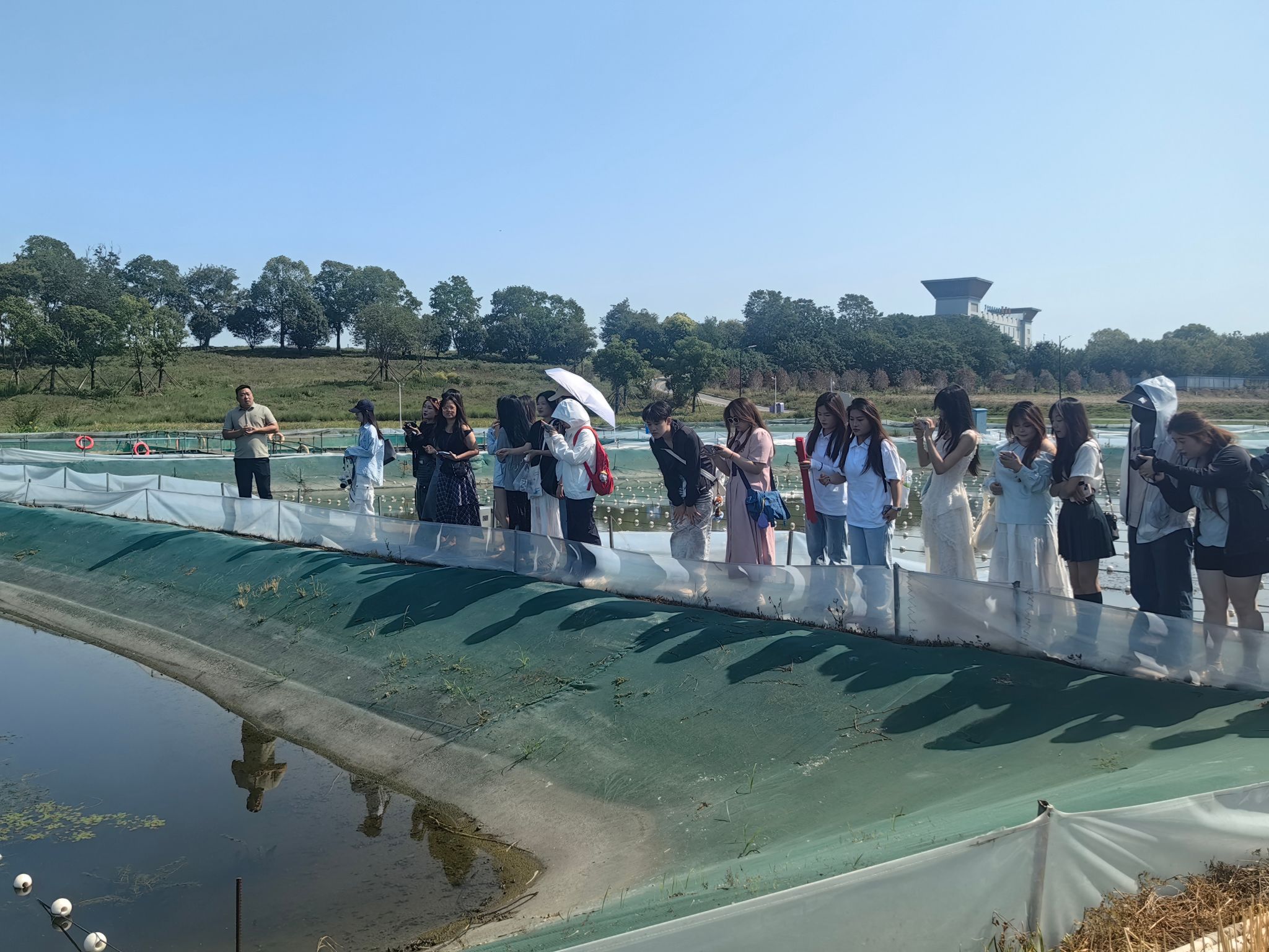 蒋坝古镇坐落于洪泽湖畔,距今已有1800余年历史,因洪泽湖大堤而兴,素有“苏北小南京”之称。青石板路串联起明清风格建筑群,“蒋坝院子” 品牌改造的老街旧宅已成为集餐饮、艺术、茶饮于一体的网红打卡地。活动中,师生们在当地村支书带领下,先后走访螺蛳产业基地、“醉美三公里”景观带、云沧海民宿、快活岭湿地花田等特色点位,深入了解古镇的特色产业、自然风光与河工文化。镇水铁牛、三河闸等历史遗存与“荧光小道”“落霞湾”等网红景点相映成趣,为创作提供了丰富素材。
