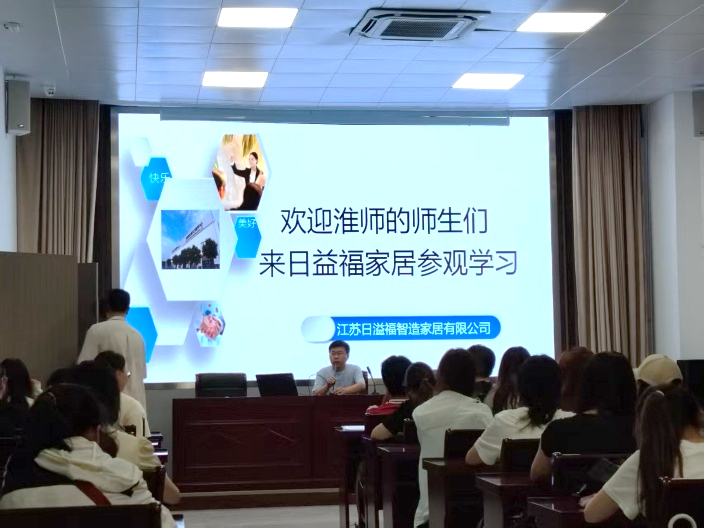 周集村的乡村发展考察结束后,同学们走进了江苏日益福智造家居有限公司。作为本次实践活动的核心环节,日益福智造家居以创新科技与传统工艺和完美结合,向师生们展示了家居行业的智能化转型与可持续发展道路。为了让同学们能深入了解公司的核心理念及就业背景,日益福智造家居有限公司胡建岭经理为同学们开设了一场讲座,据了解,日益福品牌创立于2004年,获得“江苏省名牌产品”“江苏省著名商标”等荣誉称号,旗下拥有“日益福全屋定制” “日益福软体家居” “日益福实木家具”三大定制核心体系,经过该讲座,同学们对公司的企业文化、企业理念和简历创作都有了深刻认识。在胡建岭经理的带领下,同学们首先参观了家居智造公司的样板房,在与经理的交流中,同学们了解到在环保理念深入人心的今天,日溢福智造家居将可持续发展融入企业基因,公司采用环保材料,优化生产流程以减少能源消耗,并通过回收再利用实现资源循环,这种智造模式不仅降低了生产成本,更赢得了市场的广泛认可。随后,师生们来到厂房,近距离观摩了智能家居产品的制造过程,不同区域的工人进行着分区工作,该措施确保了厂房实现高效组装,工人们向同学们详细讲解了机器的运行方式,胡建岭经理介绍道:“我们的产品不仅注重功能性与美观性,更通过智能化技术为用户提供个性化定制服务,让家居真正懂得用户需求。”