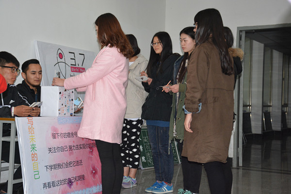 共计568本《女大学生安全手册》已经分发到每位传媒女生手中,只有15页内容,但每张均是由学生手绘而成,唯美的画风、活泼的形象、俏皮的文字使得原本枯燥乏味的女大学生安全教育知识变得更易于接受,这增强了女大学生安全教育的实效性和针对性,切实提高女大学生的安全意识和安全防范能力。除此,传媒1501班还专为女生举办“你写信 我跑腿”服务,以引导当代女生关注自身、发掘自身的不足和亮点,增强自信心,更好地完善自己。只要在3月7日这天,女生们填写明信片内容并留下所要寄出的地址和时间,就会有专人依据地址按时送出。随机抽取一张,只见上面写着:我希望在一学期之后还能看见今天我写下的承诺,为了更好的生活,我一直都在奋斗!(请于2016.6.30寄到20#608)——陈媛媛