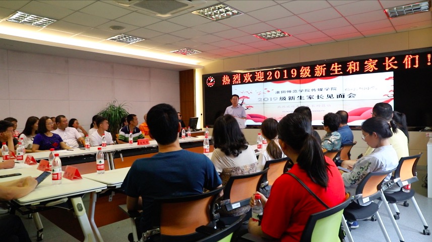 史晖代表学院对各位家长的到来表示了热烈的欢迎。史晖向家长们介绍了传媒学院的创学历史和创学条件,以及传媒专业在当今的发展概况,并详细阐述了学院的人才培养方案,他强调,把孩子送到淮师传媒学院,学院会围绕成长、成才、成人三步好好培养孩子,让家长放心。