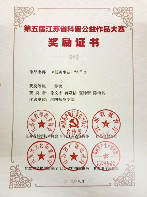 9月7日上午,由省科协、省委宣传部、省教育厅、省文化和旅游厅、省广电局、团省委主办,省科学传播中心和省科教影视协会承办的第五届江苏省科普公益作品大赛颁奖仪式于南京国际展览中心举行。由吴颖老师指导,传媒学院徐文杰、蒋焱洁、夏钟贤、陈海豹团队的作品《低碳生活—“行”》荣获一等奖、由徐珊老师指导的刘春的作品《再利用只需要一瞬间》荣获三等奖。
