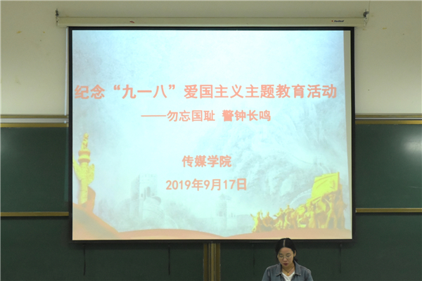 今年是“九一八事变”88周年,为加强爱国主义教育,引导学生铭记历史、勿忘国耻,培养爱国、爱党、爱校情怀,9月17日,传媒学院围绕“铭记历史 爱我中华”主题,号召全体新生,于弘文阶103开展了纪念“九一八”爱国主义主题教育活动。