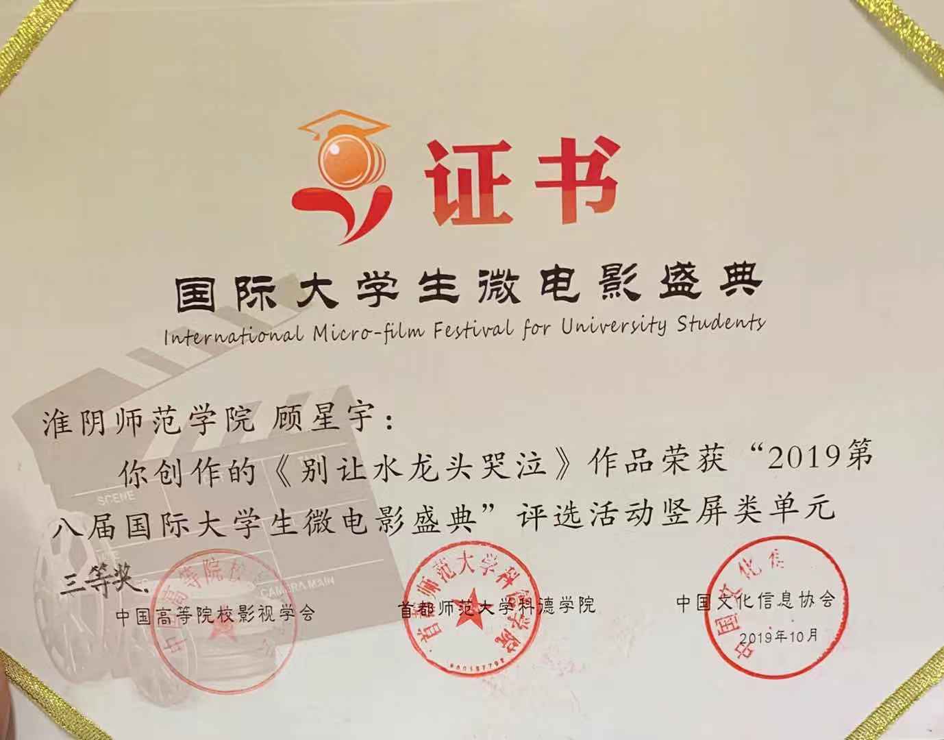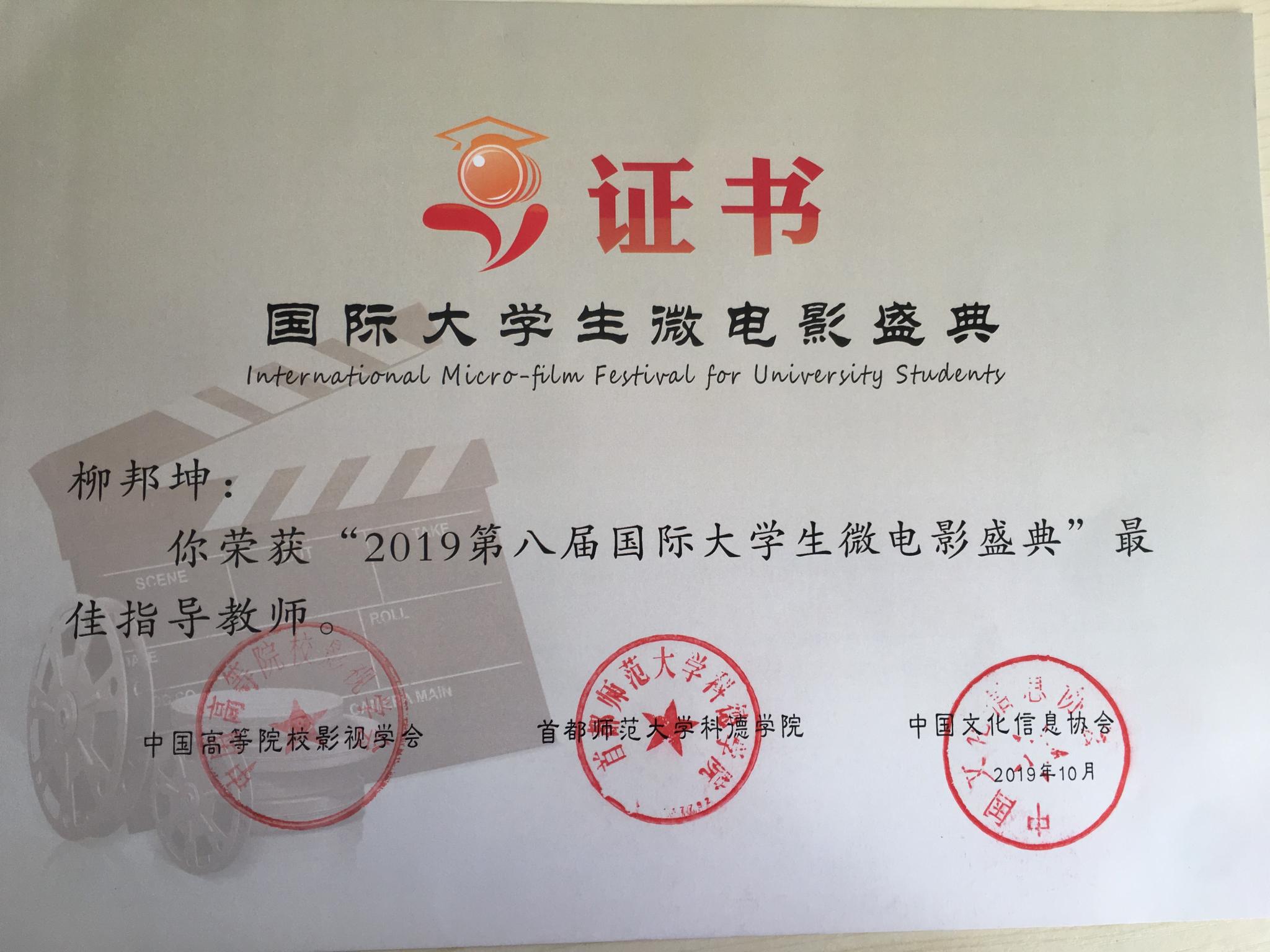 2019年10月26日,第八届国际大学生微电影盛典和第二届“喜幽优”喜剧短视频展映及优秀作品表彰活动在京隆重举行。800cc全讯白菜传媒学院顾星宇同学的作品《别让水龙头哭泣》荣获竖屏类单元三等奖,传媒学院柳邦坤老师荣获最佳指导教师奖。