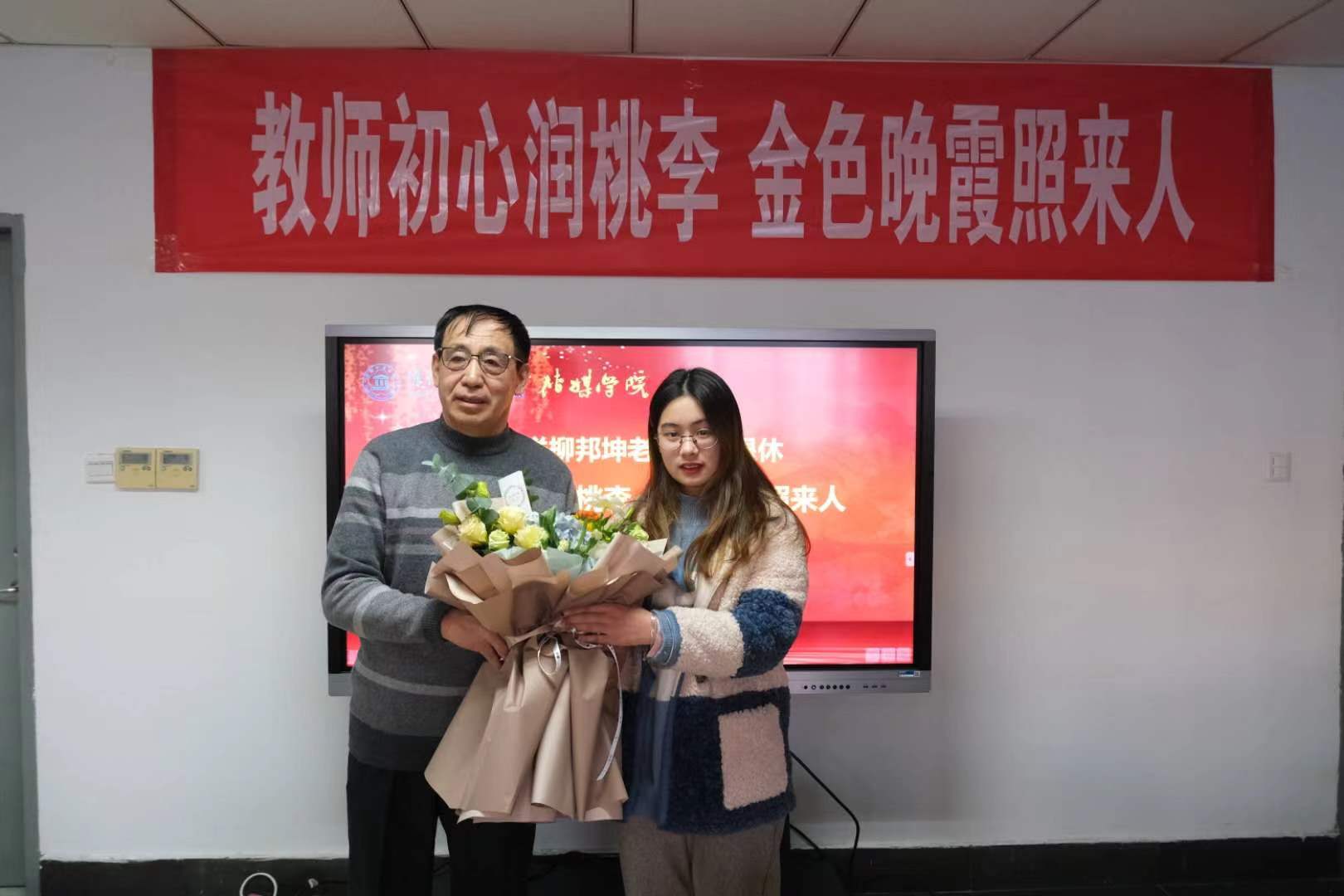 校工会主席金钊代表校工会祝贺柳邦坤教授光荣退休,他认为,教师首先应该做师德高尚的“圣人”,要以德立身、以德立学、以德施教;其次,要做关心学生的“贵人”,全方位地围绕学生、关照学生、服务学生;还要做情趣高雅的“达人”,让生活多一些色彩,多一些闲情雅趣。柳邦坤教授12年来始终如一地坚守着自己热爱的教育事业和可爱学生们,他用行动真正实现了自我的价值和生活的幸福。