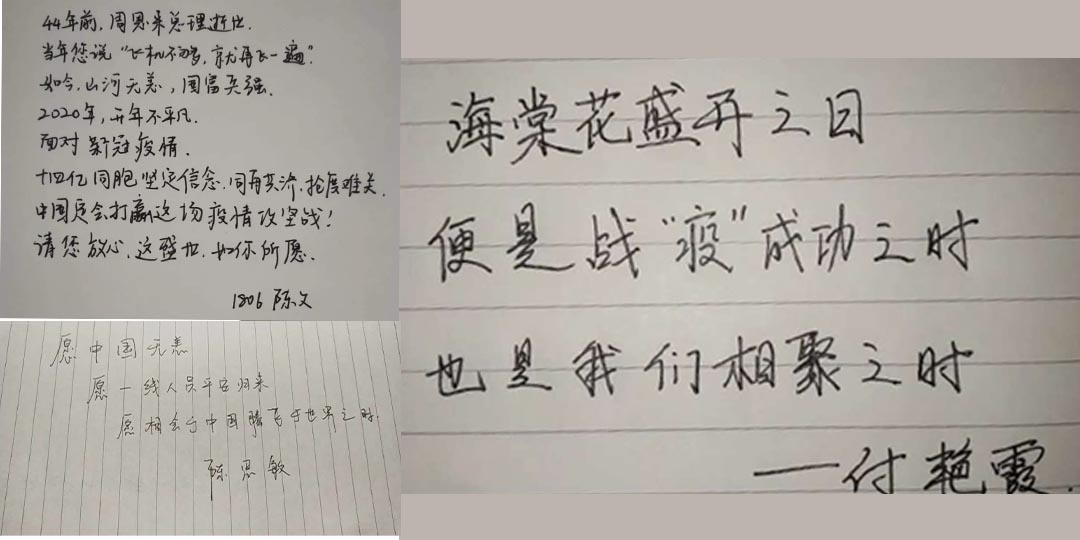 交流会伊始,主持人郝利华引导全体同学观赏学习强国平台中的视频——“《周恩来》我们一定会战胜困难、重建家园”与“电影《周恩来回延安》主题曲《从未离开过我们》”。1806班的同学手写感想寄相思,“海棠花盛开之日,便是战“疫””成功之时,也是我们相聚之时“”愿中国无恙,愿一线人员平安归来“。