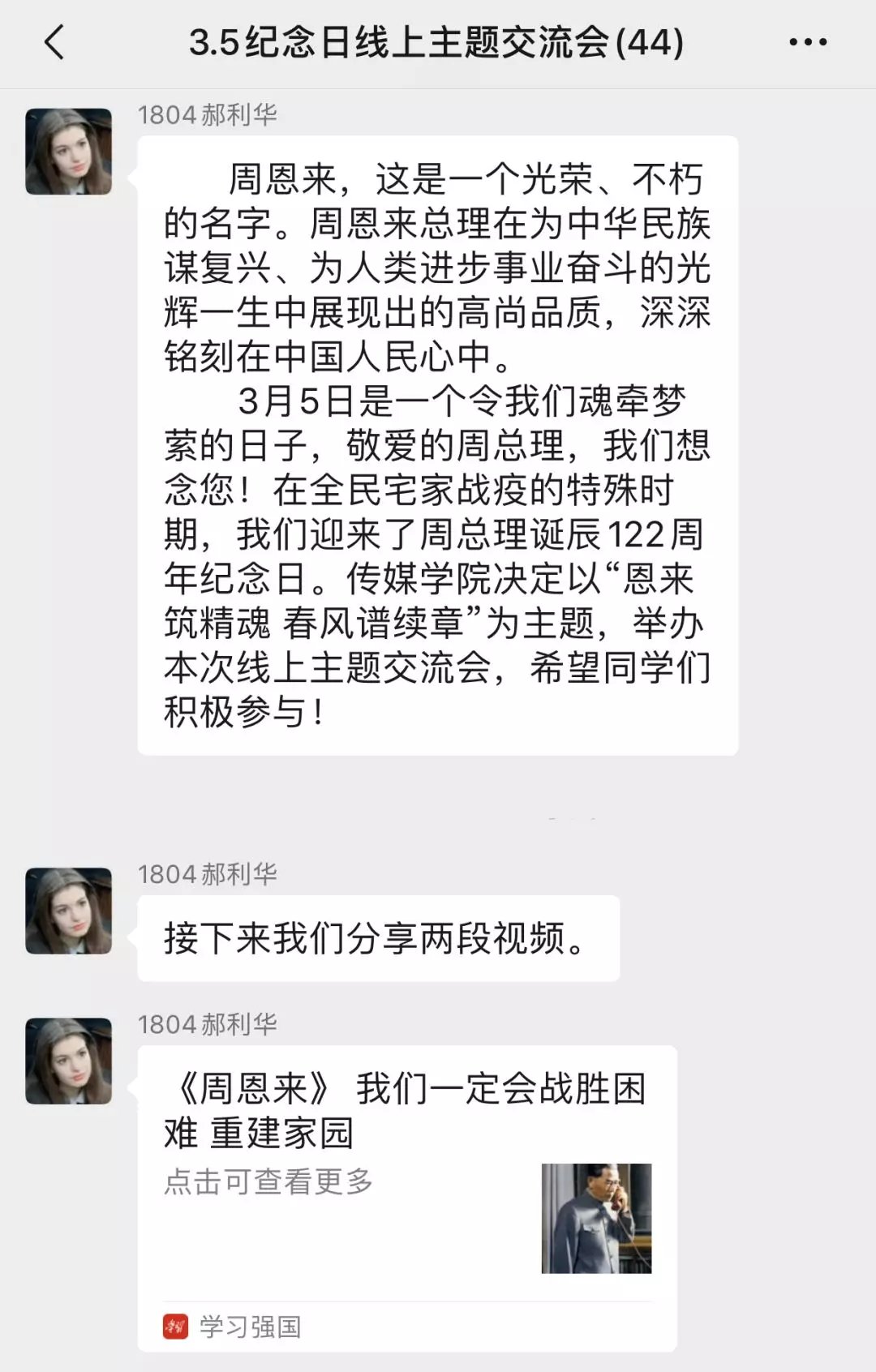 周恩来,这是一个光荣的名字、不朽的名字。3月5日,是敬爱的周总理诞辰122周年纪念日。疫情期间,为充分发挥周恩来班先锋模范作用,传媒学院举办“恩来筑精魂 春风谱续章”线上主题交流会,由1705班、学周部牵头,1804、1805、1806、1904、1905班共同参与。