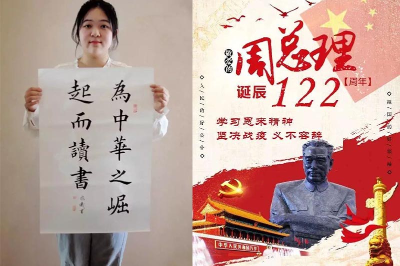 交流会最后,学生会展示为纪念周恩来诞辰122周年的作品,1904班赵家仪书法作品《为中华之崛起而读书》、1805班郝云清海报作品以及诗歌朗诵《颂周总理》,他们执笔寄相思,用声音表达敬爱之心。