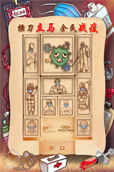 作品寓意:运用华容道元素,设计多种群众职业类型,将病毒牢牢的困在视线范围之内。多用深色色调表达出严肃谨慎的公众情绪,绘制多种医疗器械来呼应敬畏奔走在一线的防疫工作者们,预祝这场全民战“疫”早日结束,恢复民族的繁华与热情