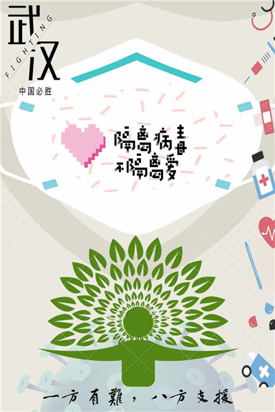 作品寓意:本作品把一个人脸形象化,戴上一个口罩,口罩外面包裹着病毒,病毒被拒之门外。即使有病毒,我们也不能不该隔离武汉,应该万众一心共同抗疫,绿色叶子象征着全国各地向武汉伸出支援的手,也预示着不久之后病毒治愈,人们可以呼吸到新鲜空气。武汉fighting,中国人民与你同在。
