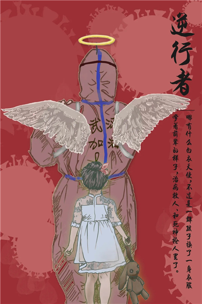 医生右手拍自己的左肩,是在给自己及全人类加油。小女孩左手微微翘起的小手指,有拉钩的含义,也是孩子幼小心灵中暗自约定的未来。光圈和翅膀有铁丝和肩带,说明“天使”并不存在的,奋力保护着我们的也是一群普通的人!