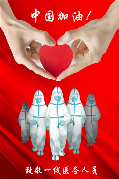 作品寓意:红色背景采用的是我国国旗的颜色和旗帜纹理,代表抗击疫情是全国公民一起努力的事情,并且中国核心价值观也一直在指引我们前行,图中穿着防护服的医生团队代表着所有在一线默默付出的医务人员,他们捧着一颗心来,不带半根草去,把患者的事情放在第一位,所以这个海报的主题是,致敬一线医务工作人员。