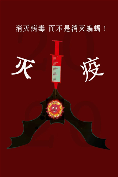 作品寓意:用“消灭病毒而不是消灭蝙蝠”作为标题,加上“灭,疫”,针剂,蝙蝠和病毒。他们组成了一个大字灭。含义是在消灭病毒,色调为红色是中国红,浅浅的2020表示了年份。表达了我们对这次战胜疫情的强烈希望。蝙蝠是完整的,而病毒是破碎的,也是反映了之前的那句话,“消灭病毒而不是消灭蝙蝠”。