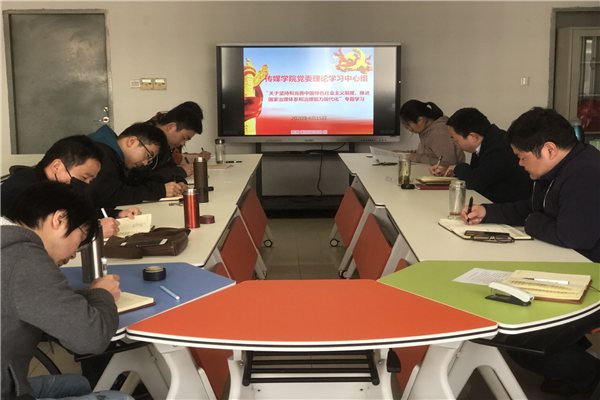 4月15日上午,传媒学院党委理论学习中心组举行第二次集中学习会,专题学习研讨坚持和完善中国特色社会主义制度、推进国家治理体系和治理能力现代化,院党委理论学习中心组成员参加学习。