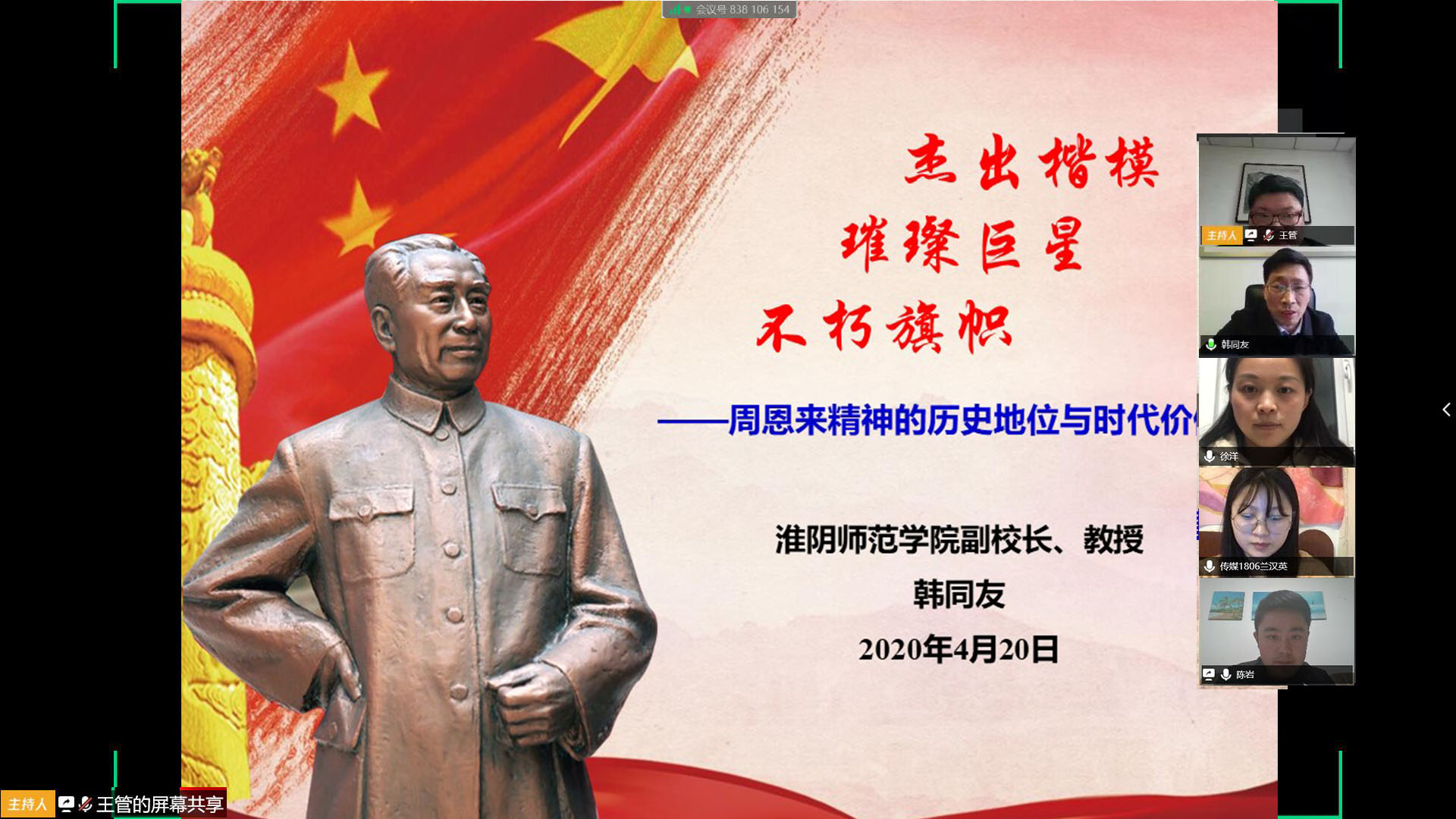 4月20日下午,传媒学院“传习讲堂”第二讲邀请800cc全讯白菜副校长韩同友教授作“周恩来精神的历史地位与时代价值”专题报告,本次活动通过腾讯会议线上直播的形式开展,传媒学院部分“周恩来班”创建班级参与本次线上讲座。传媒学院党委书记王管主持讲座。