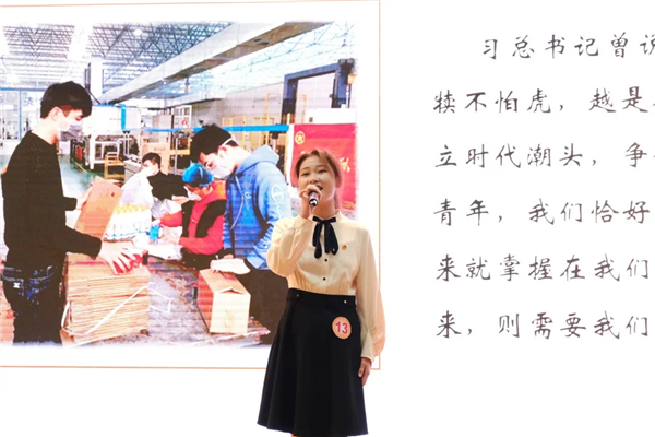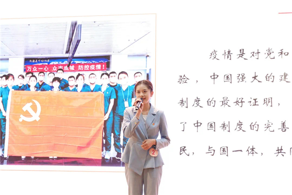 图为卢思瑶进行以《党旗飘扬,凝聚抗疫“硬核力量”》为主题的演讲现场。记者 降怡 摄