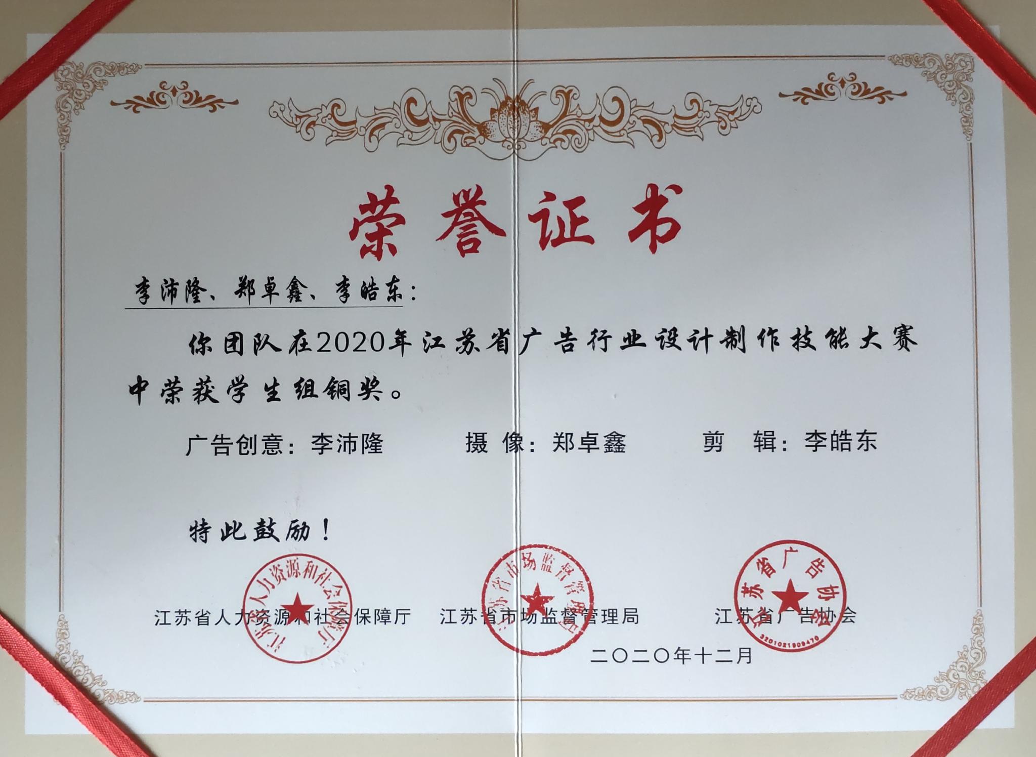 近日,2020年江苏省广告行业设计制作技能大赛在南京举行,本次比赛吸引了32支职业组代表队和18支学生组代表队共计200余人前来参赛,其中,由传媒学院王管、施宇老师指导,李沛隆、郑卓鑫、李皓东同学共同创作的作品《那年那月》荣获学生组铜奖。