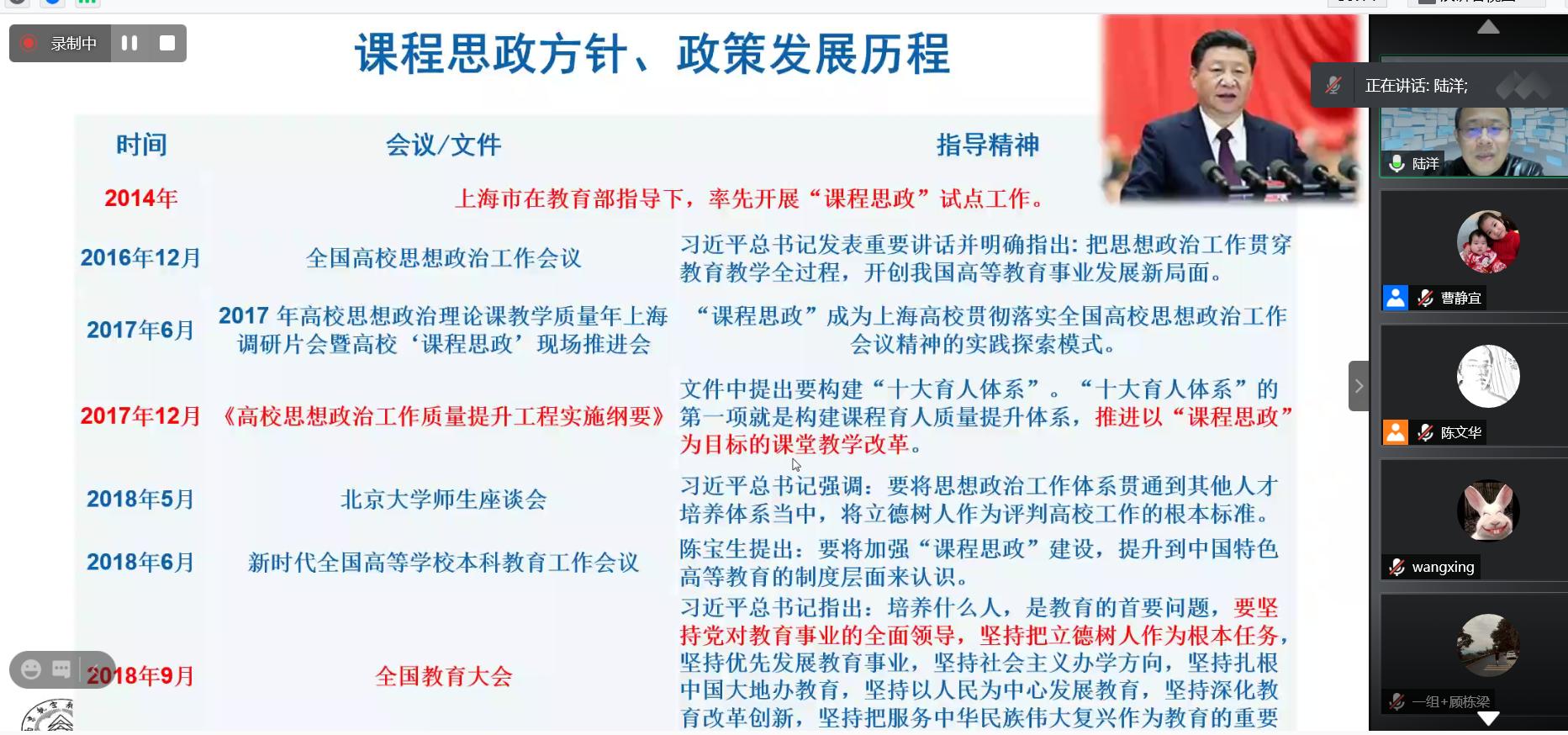 本次培训分为“课程思政是什么?”“课程思政教什么?”“课程思政怎么教?”三个方面,陆教授从“白鹿洞书院教条”、上海大学课程思政通识课程探索等阐释了课程思政的起源、发展脉络。他通过解读课程思政的内涵、高等学校课程思政建设指导纲要、教学的三个目标维度等,深入分析了课程思政内容的选择、融入路径和标准。并通过大量鲜活的课程思政教学案例分析,展示了多元化教学方法、组织和引导学生积极参与和体验、拓展教学时间与空间、人力资源应用、社会资源的发掘和应用、网络应用等课程思政融入教学实践的具体实施办法。