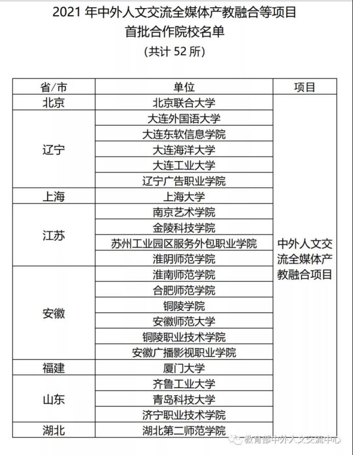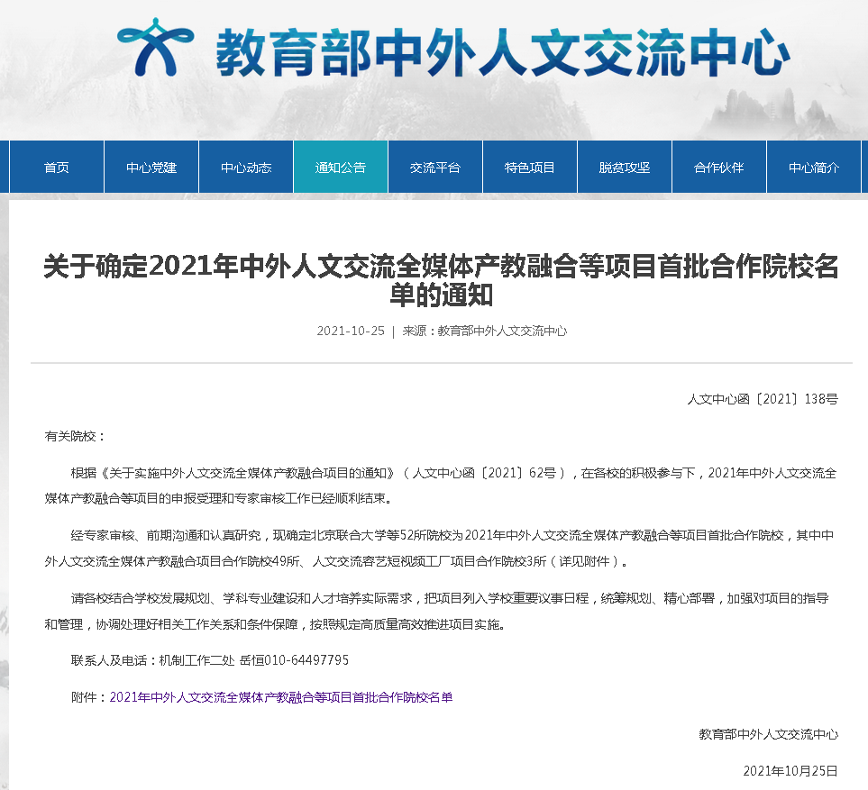 10月25日,教育部中外人文交流中心发布了《关于确定2021年中外人文交流全媒体产教融合等项目首批合作院校名单的通知》,我院申报的项目成功入选。