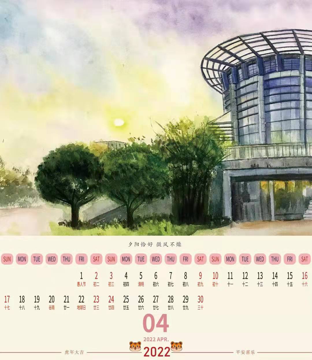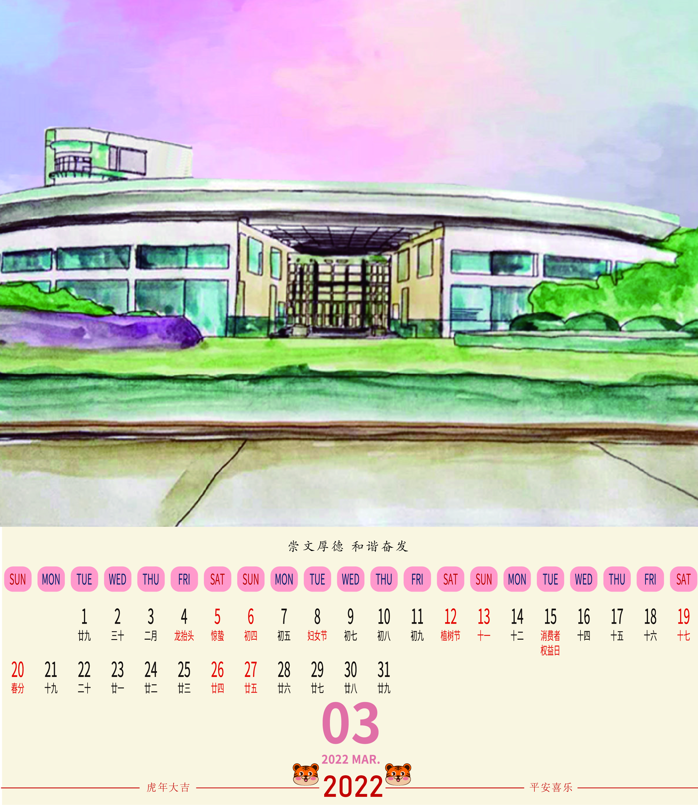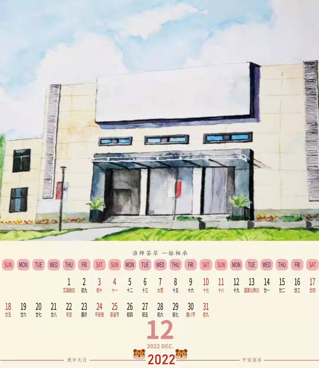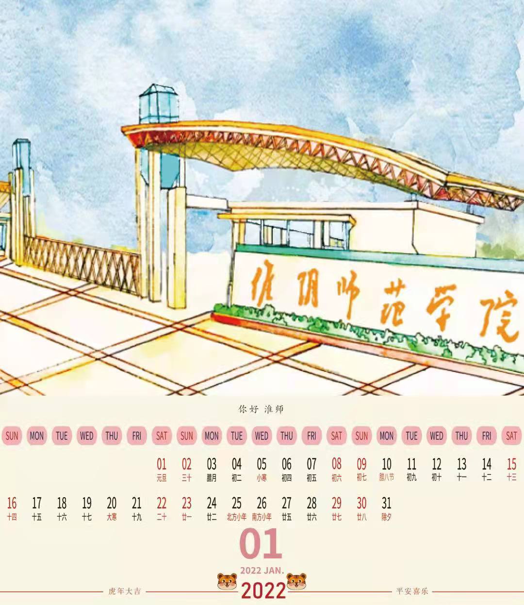 虎年即将到来,传媒学院007工作室在吴颖老师的指导下,以虎的元素为主,采取手绘的方式,将淮师的建筑融入到2022年的台历中。整个台历的主色调设定为红色,采用中心型构图,让画面看起来更大气,也能更加契合新年的气氛。