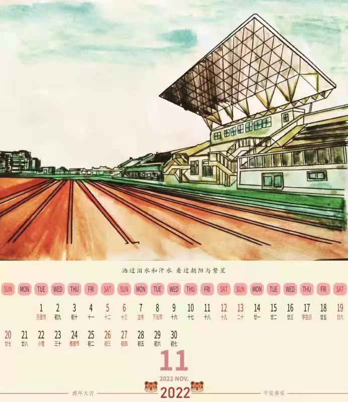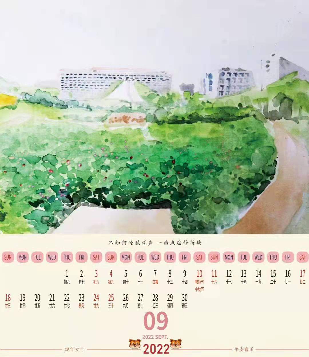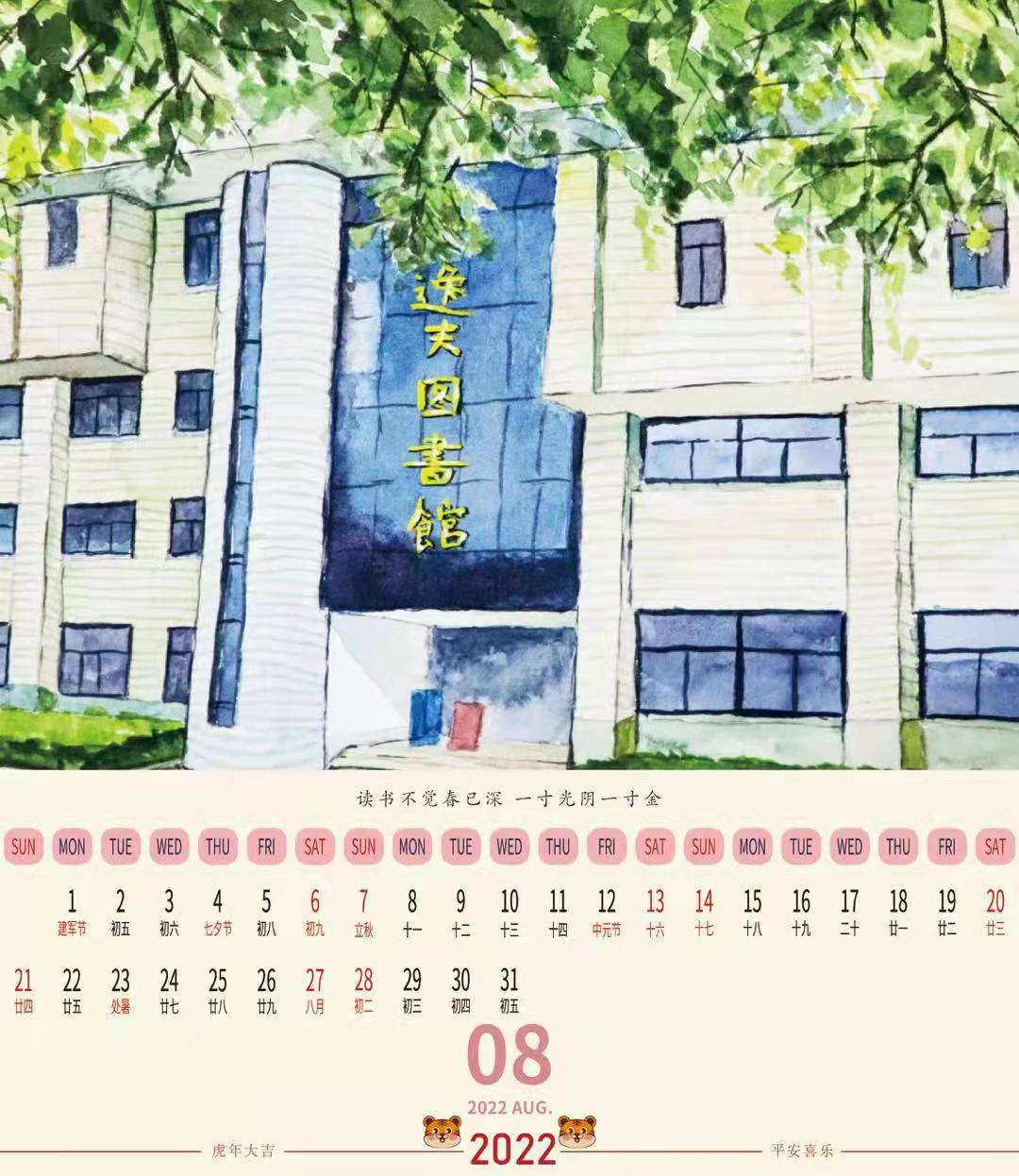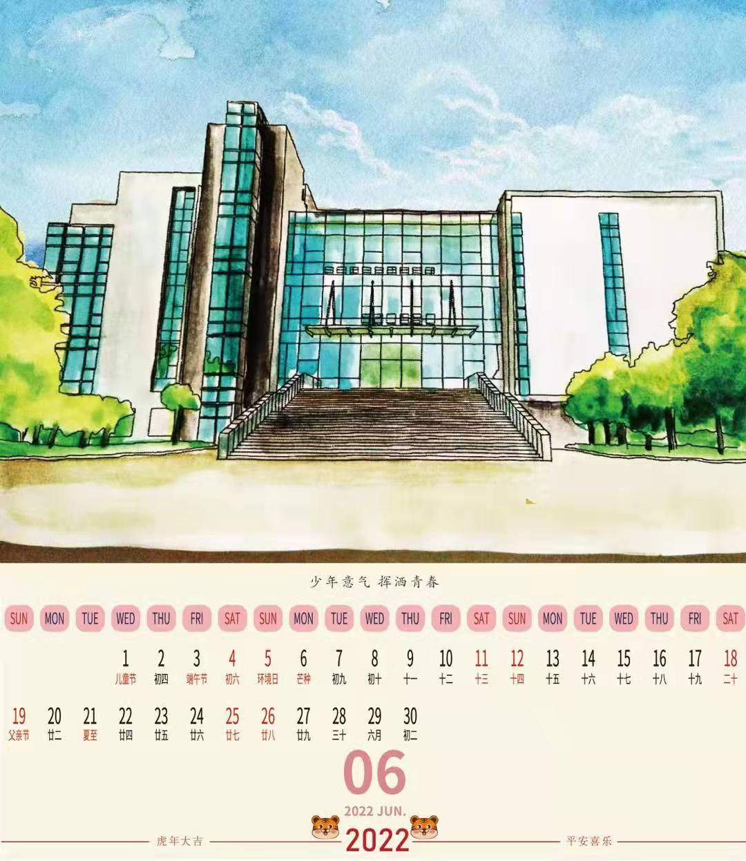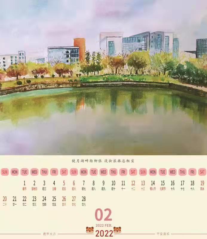 虎年即将到来,传媒学院007工作室在吴颖老师的指导下,以虎的元素为主,采取手绘的方式,将淮师的建筑融入到2022年的台历中。整个台历的主色调设定为红色,采用中心型构图,让画面看起来更大气,也能更加契合新年的气氛。