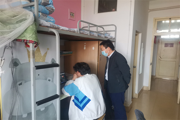 4月4日下午,传媒学院党政领导班子全体成员和全体辅导员分四组深入学生宿舍,推进当前疫情防控和主题教育月工作。