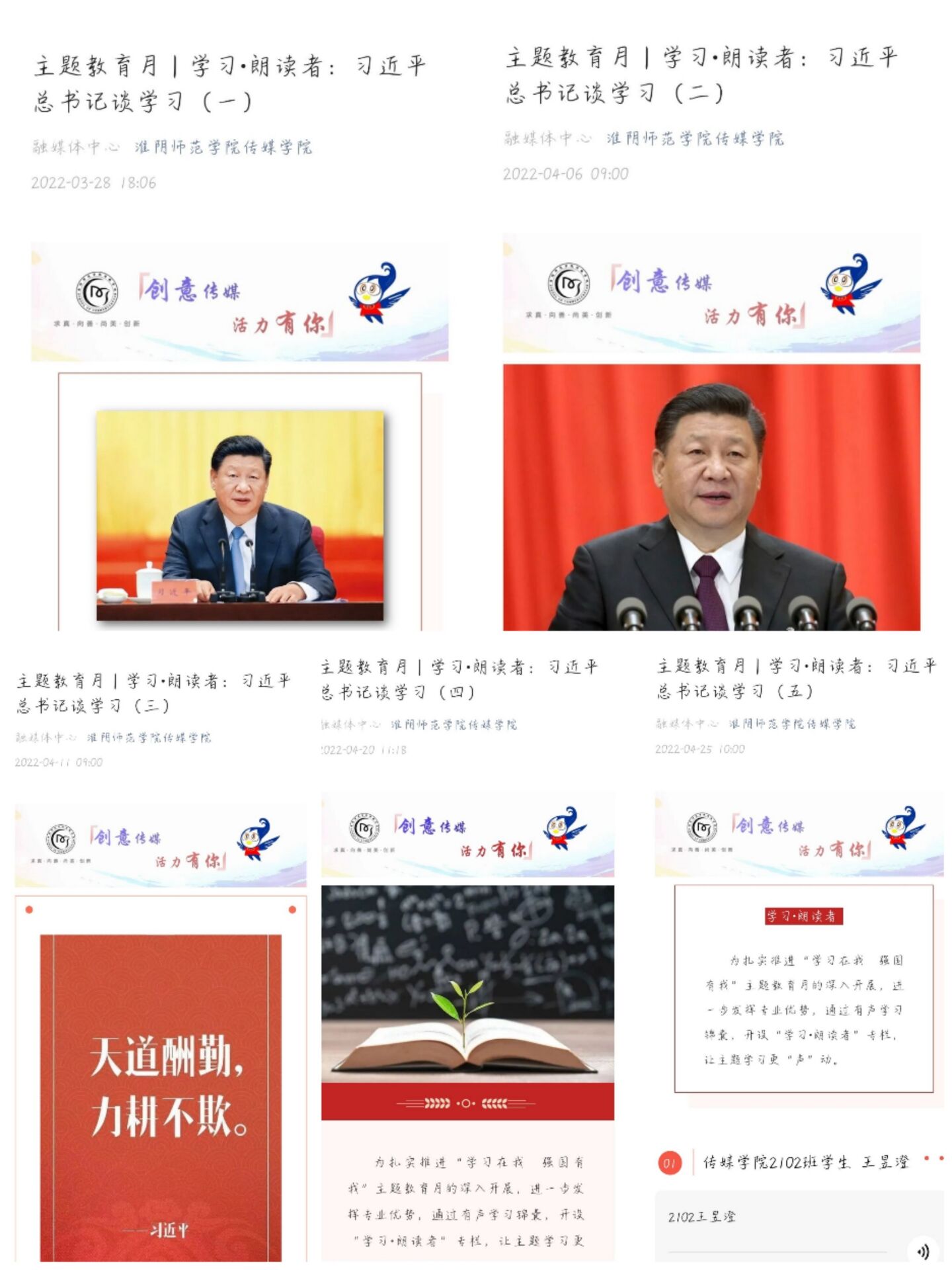专业领航,督改学风有广度。传媒学院学工办、团委、教务办携手推出多维度、多层次、多角度学风建设提优活动。发挥专业优势,学院微信公众号连续推出5期“学习.朗读者:习近平总书记谈学习”,让主题学习更“声”动。“最美读书笔记”线上展评促进同学相互学习,“最美读书人”摄影短视频大赛”鼓励同学们做到专业学习和疫情防控两不误。