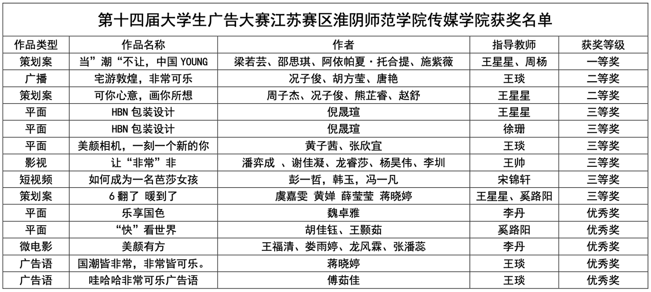 日前,第十四届全国大学生广告艺术大赛江苏赛区评选结果揭晓。淮阴师范学传媒学院学子在该项赛事中再创佳绩,共获得14个奖项,其中一等奖1项,二等奖2项,三等奖6项,优秀奖5项,以上获奖作品同时入围国赛评审。
