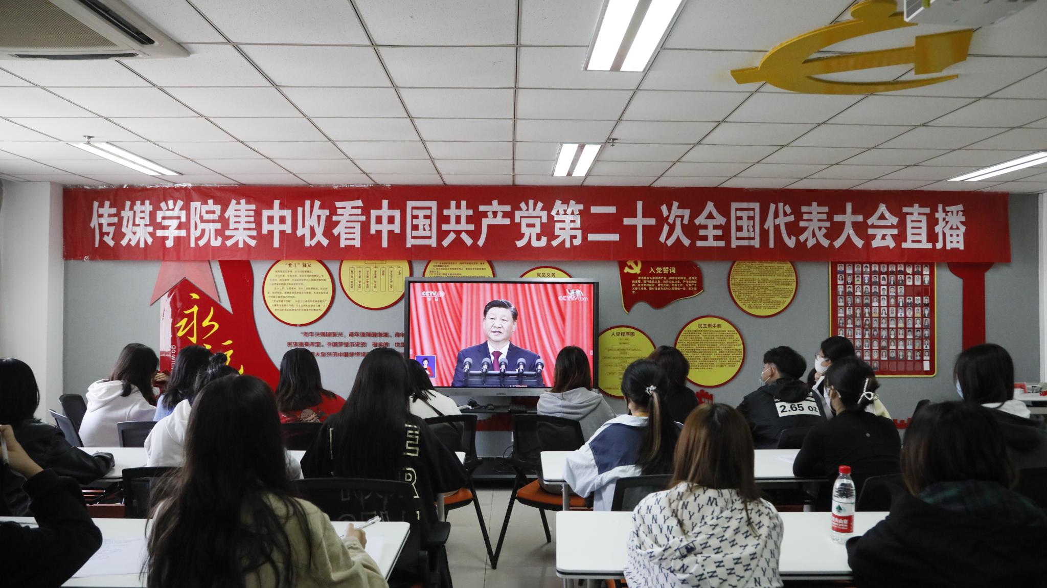 10月16日上午,传媒学院党政领导、师生党员、团员代表在学院北斗党建工作室集中收看中国共产党第二十次全国代表大会盛况。