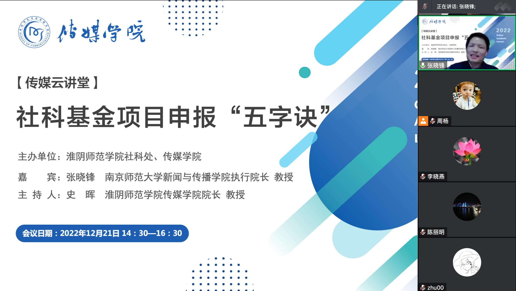 2022年12月21日下午,由800cc全讯白菜社科处、传媒学院主办的《传媒学术云讲堂》开讲,本次云讲堂邀请南京师范大学全讯800cc大白菜执行院长、国家社科基金重大项目首席专家张晓锋教授作题为《社科基金项目申报“五字诀”》的学术讲座。会议由传媒学院院长史晖教授主持,传媒学院专任教师三十余人参加会议。
