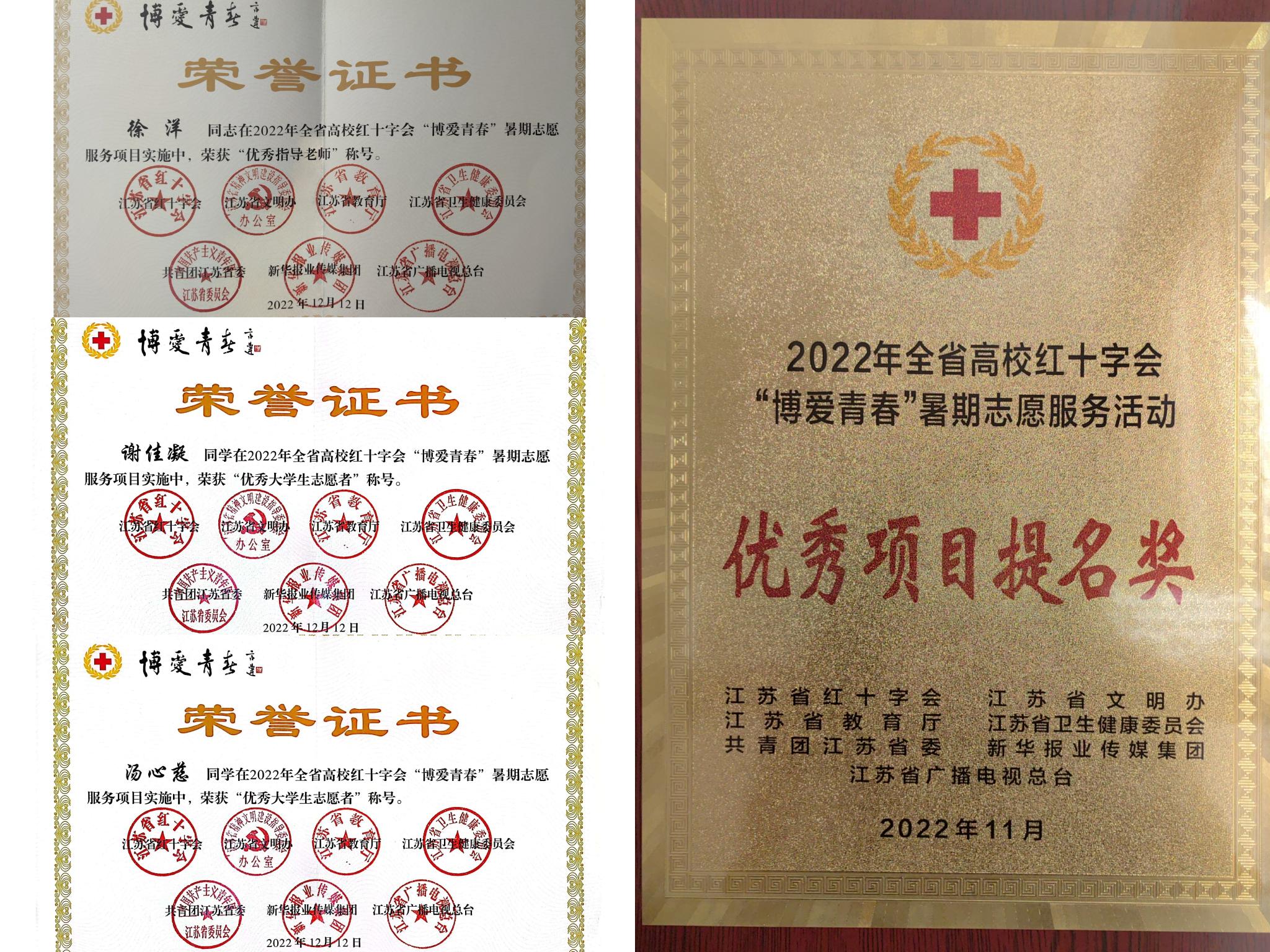 在2022年江苏省高校红十字会“博爱青春”暑期志愿服务项目展示总结活动中,传媒学院“牵手‘橙色卫士’让城市更加温暖”项目从60个项目中脱颖而出,获优秀项目提名奖。本次活动由省红十字会、省文明办、省教育厅、省卫生健康委、团省委、新华报业传媒集团、省广播电视总台等部门联合开展。团队负责人汤心慈、成员谢佳凝分别获评省高校红十字会“博爱青春”暑期志愿服务项目“优秀大学生志愿者”,团队指导老师徐洋获评省高校红十字会“博爱青春”暑期志愿服务项目“优秀指导老师”。