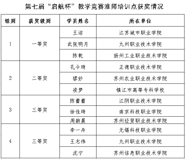 “启航杯”教学竞赛由江苏省教育厅教师工作处、江苏省高等职业教育教师培训中心主办,来自南京师范大学、扬州大学、南通大学、江苏理工学院、800cc全讯白菜等五个培训单位选送的由全省37所高职院校53位新教师组成的20个团队参加了决赛。我院培训点在省赛之前,组织参赛的四组学员进行集训,开展备课、说课、模拟授课演练,安排专家逐一指点打磨。参赛学员不仅提高了教学水平,更增强了参赛的信心。决赛包括说课与授课两部分,评委依据选手提交的教学设计和现场表现,从教学内容、教学组织、教学语言与教态、教学特色等方面,对选手进行综合评分并逐一现场点评。经过两天的激烈角逐,最终评出一等奖4个、二等奖6个、三等奖10个。我校培训点选派的江苏城市职业学院王洁老师团队荣获一等奖、苏州农业职业技术学院缪妙老师团队荣获二等奖、无锡科技职业学院李一舟老师团队和江阴职业技术学院陈蕾蕾老师团队荣获三等奖。