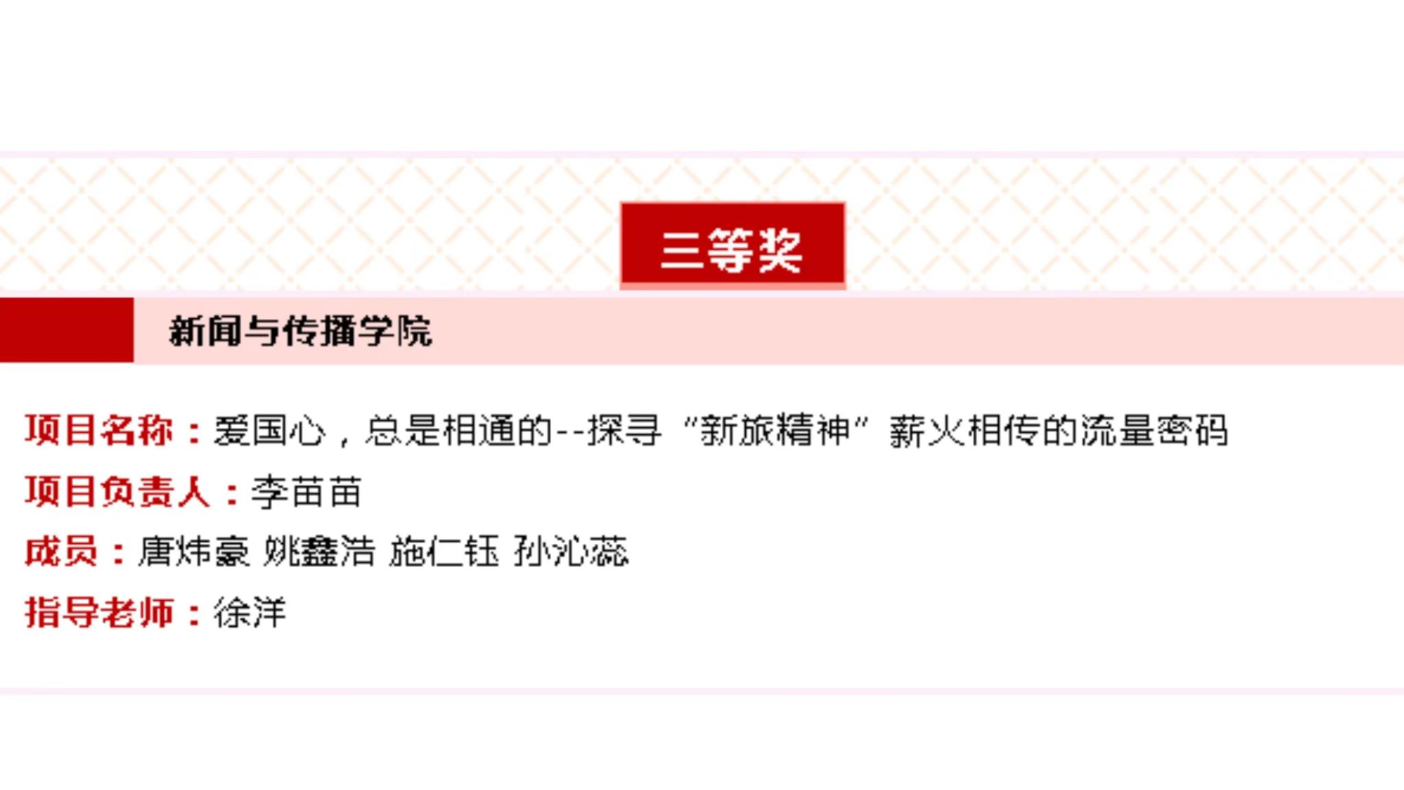 近日,第十八届“挑战杯”全国大学生课外学术科技作品竞赛红色专项活动江苏省线上选拔赛顺利落幕。经学校推荐、资格审查、专家评审、线上答辩等环节,最终新传学院推报的作品《爱国心,总是相通的——探寻“新旅精神”薪火相传的流量密码》从全省597件终审决赛作品中脱颖而出,获得三等奖。