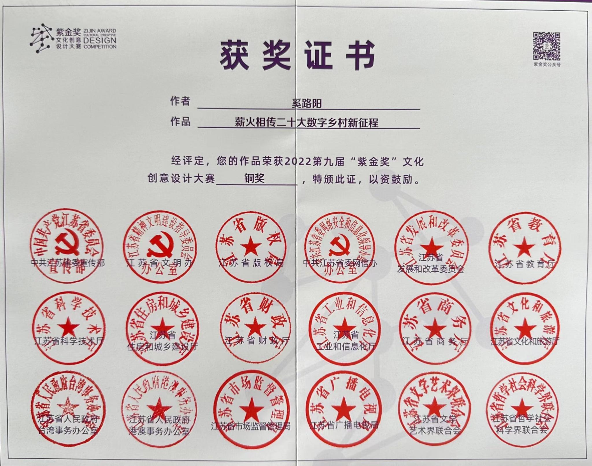 近日,由江苏省委宣传部、江苏省文明办等18家单位共同举办的2022第九届“紫金奖”文化创意设计大赛结果揭晓,新传学院副院长奚路阳获2022第九届“紫金奖”文化创意设计大赛铜奖。