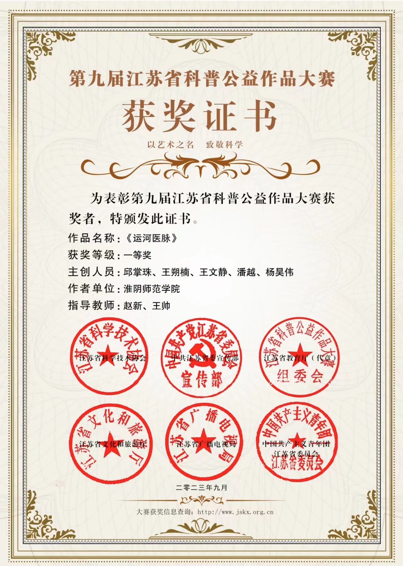我院邱掌珠、王朔楠、王文静、潘越、杨昊伟同学作品《运河医脉》荣获第九届江苏省科普公益作品大赛一等奖。赵新、王帅老师荣获优秀指导教师奖,全讯800cc大白菜荣获优秀组织奖。纪录片《运河医脉》以中医著作《温疫论》《温热论》和《温病条辨》为灵感,以沿运河而居的吴又可、叶天士、吴鞠通三位医学大家对流行疫病、特色疗法和人生经历为内容,呈现出以运河脉络串联的三位医学大家及其著作的前世今生。我院积极贯彻落实“以赛促教、以赛促学”的教学理念,夯实学生的综合素养,提高学生实践创作能力,再接再厉展现新传专业风采。