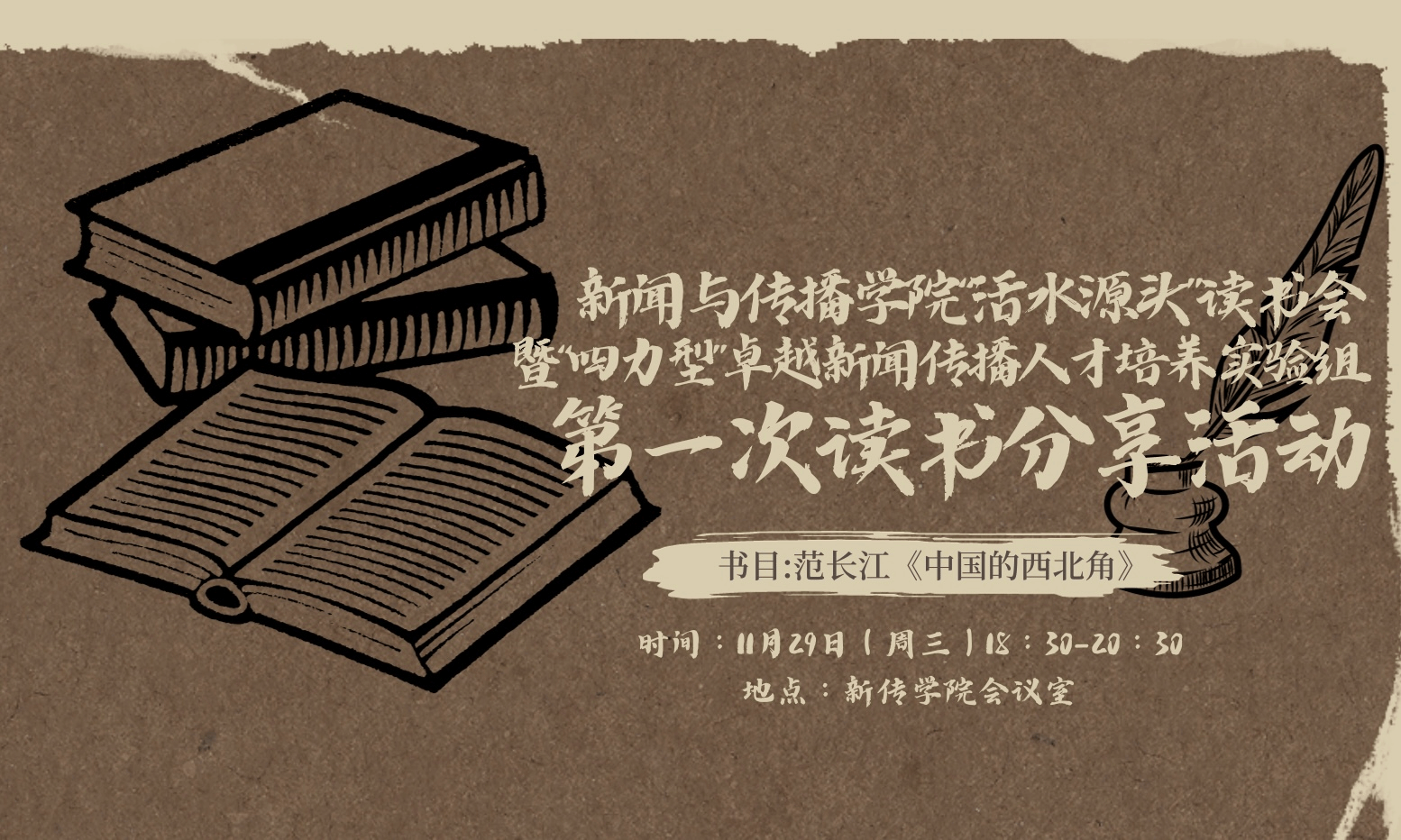 2023年11月29日晚,新传学院“活水源头”读书会暨“四力型”卓越新闻传播人才培养实验组第一次读书分享活动在新传学院会议室顺利举行,活动以《中国的西北角》一书的阅读感悟为主题。活动由李德顺老师主持,新传学院20余名同学分享读后感悟,周浒、何顺民、王新鑫、李德顺四位指导老师参加此次活动。