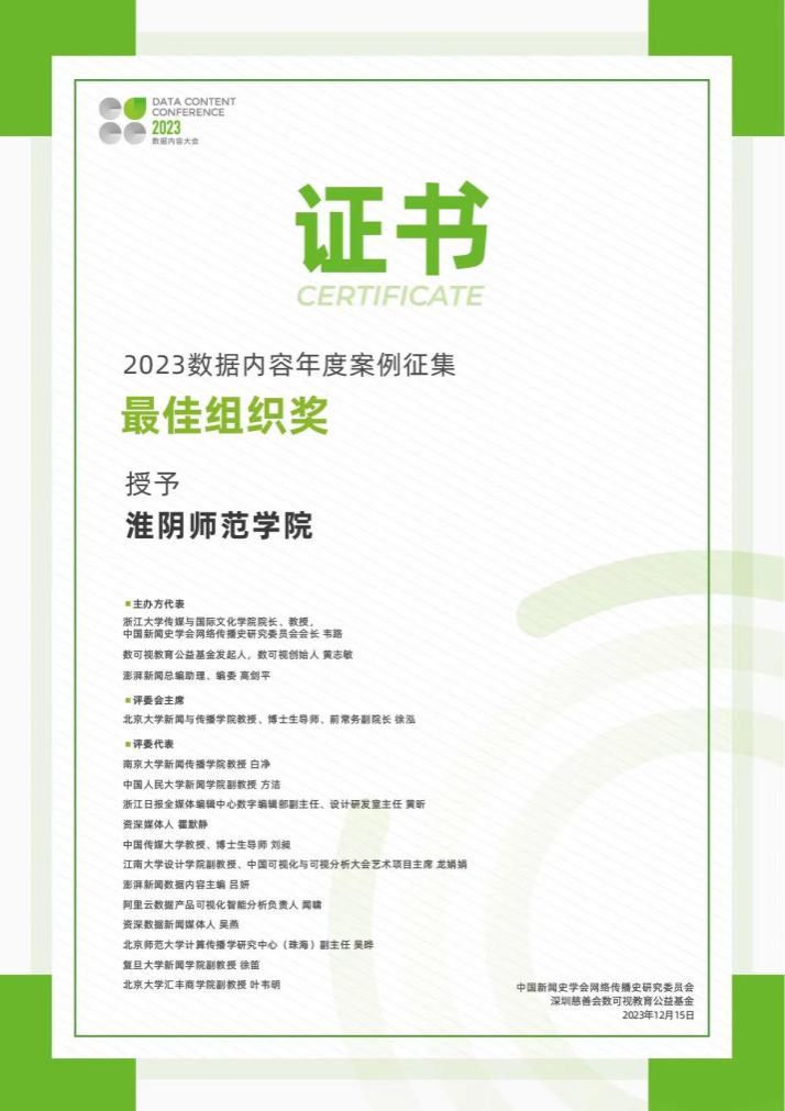 2023数据内容年度案例征集活动最终结果于2023年12月20日揭晓。全讯800cc大白菜被授予“最佳组织奖”。“2023年数据内容年度案例征集”是中国数据内容大会系列活动之一,由中国新闻史学会网络传播史研究委员会指导,浙江大学传媒与国际文化学院、数可视教育公益基金主办,澎湃新闻联合主办,北京数可视科技有限公司承办,受北京大学汇丰商学院、北京大学全讯800cc大白菜、中国人民大学新闻学院、北京师范大学计算传播学研究中心(珠海)、中国传媒大学新闻学院、复旦大学新闻学院、南京大学新闻传播学院、江南大学设计学院、浙江大学传媒与国际文化学院的学术支持。