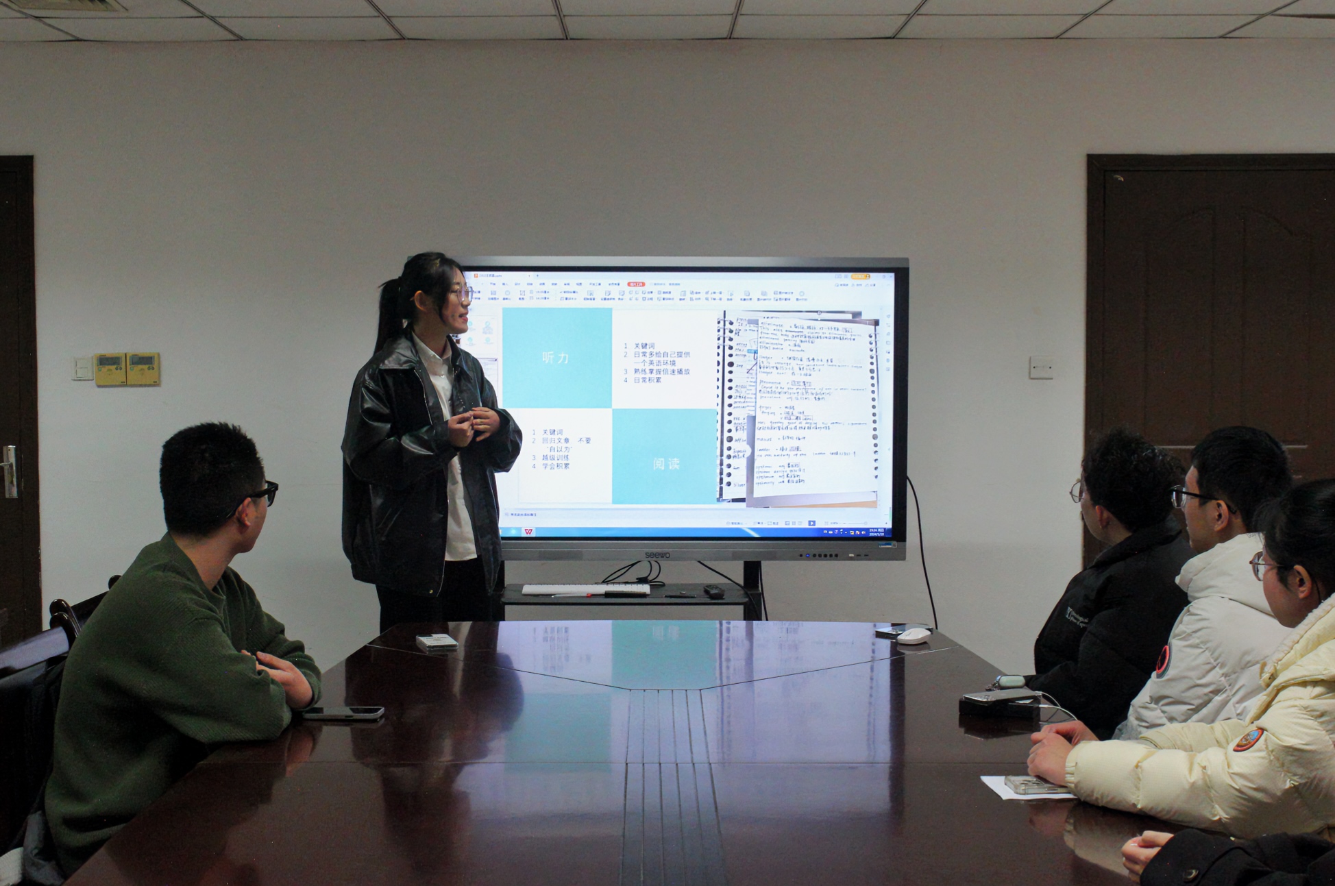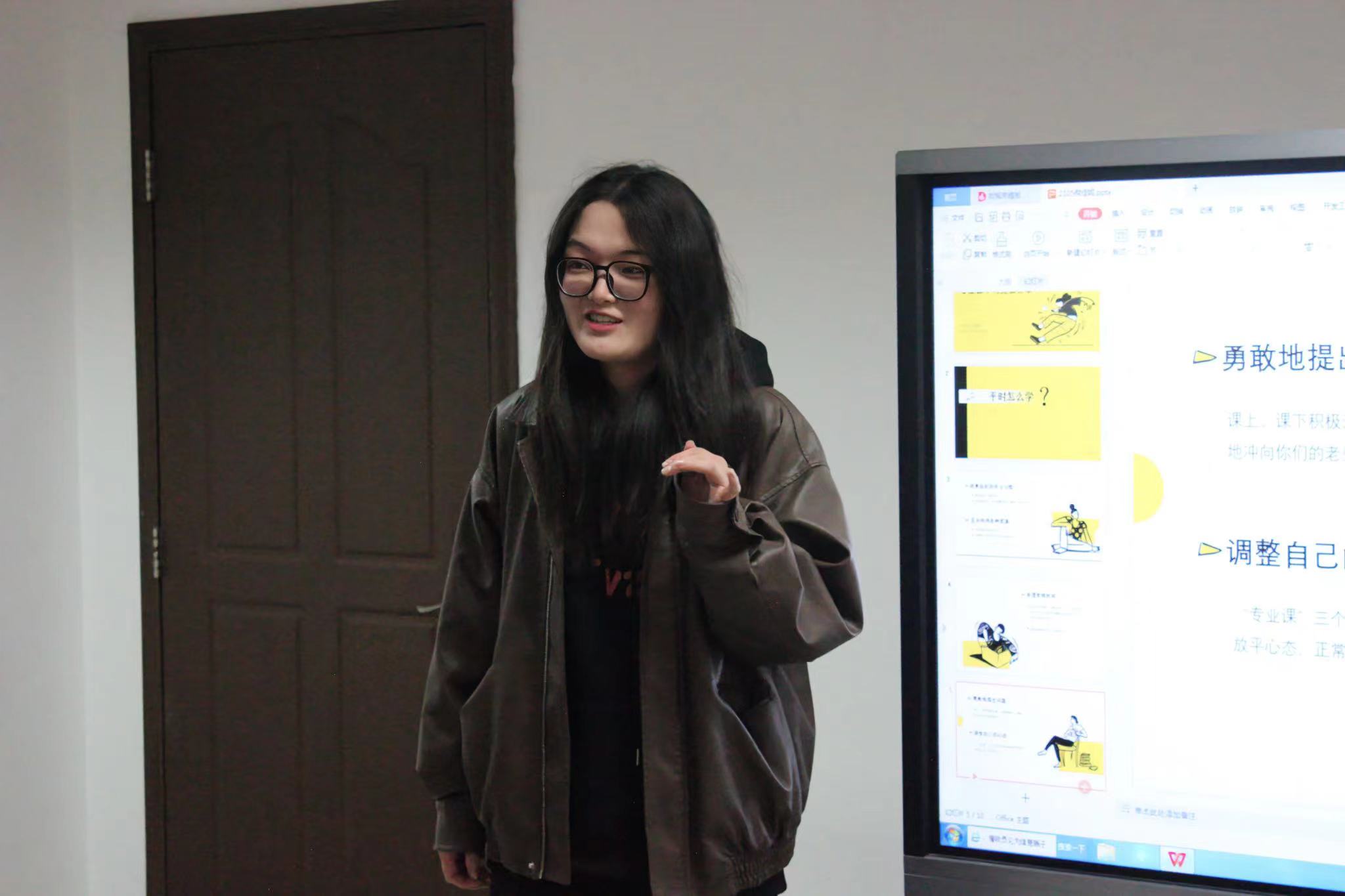 六名来自各个专业和年级的同学针对“如何适应大学生活”、“专业课学习经验分享”、“公共课学习经验分享”、“论文书写”、“专业类竞赛”五个板块进行分享。会议上,分享的同学对班级代表所带来的问题积极解答,气氛紧张有序。